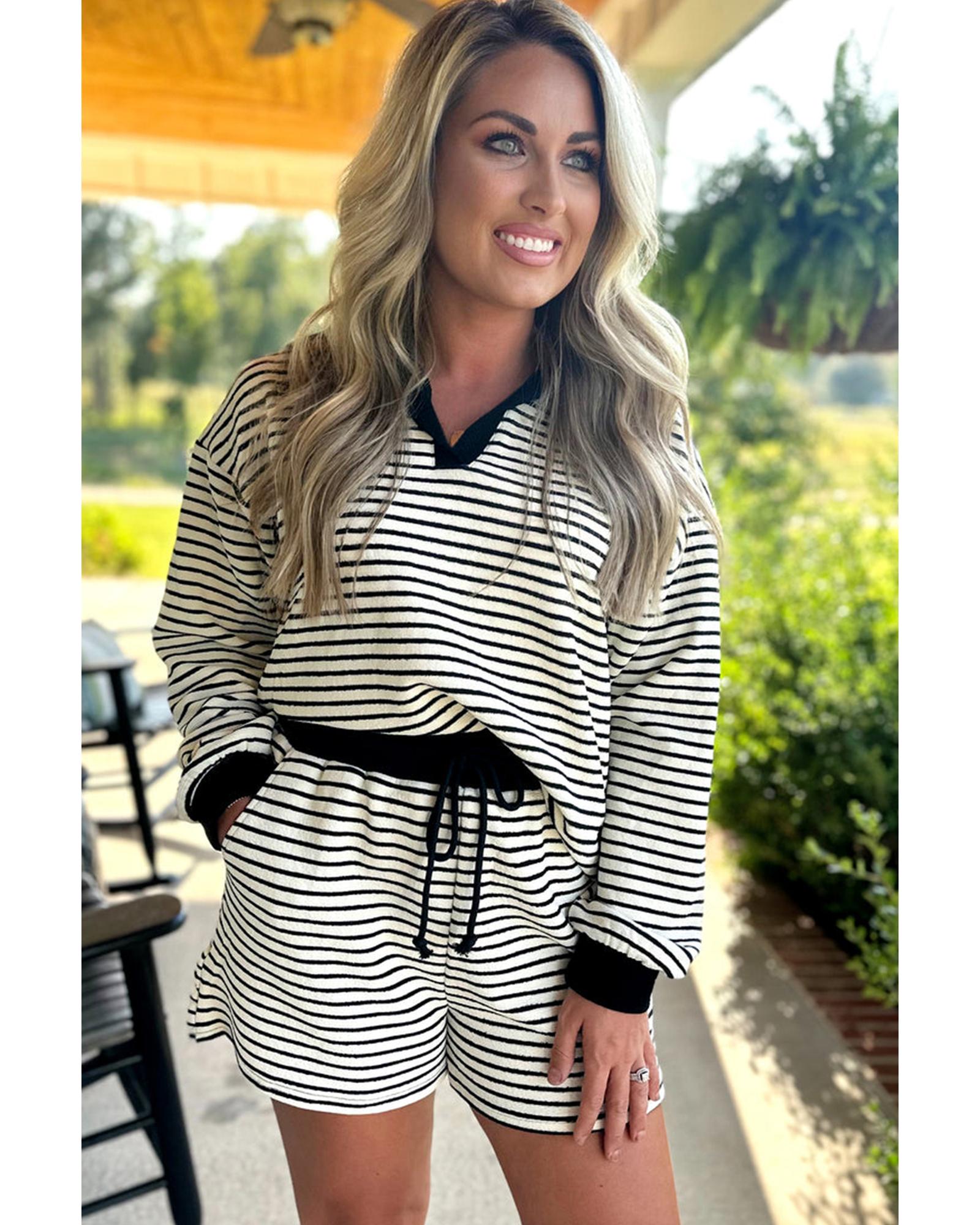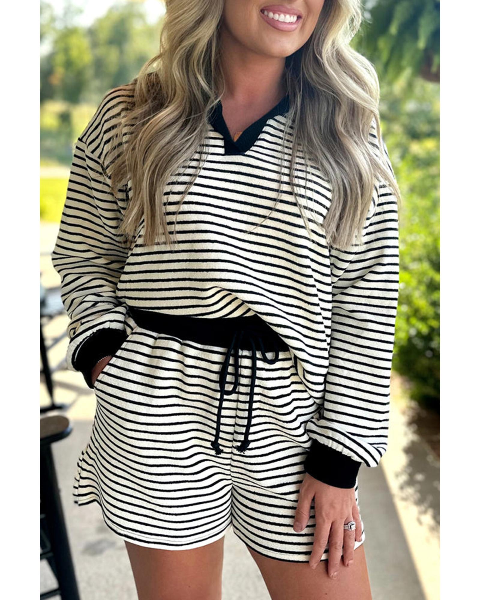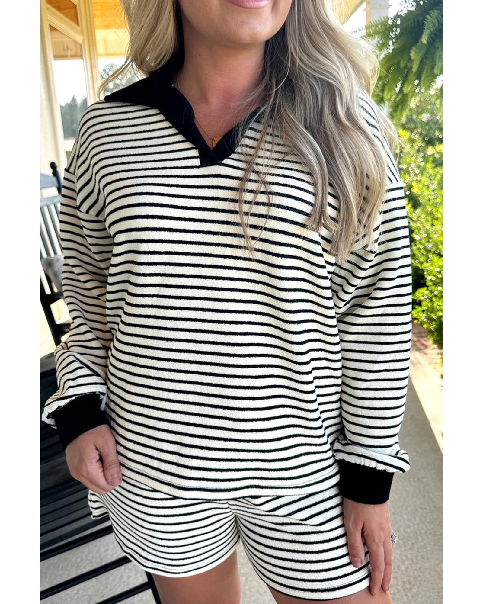 Black Stripe Collared Long Sleeve Top and Drawstring Shorts Set – XL
