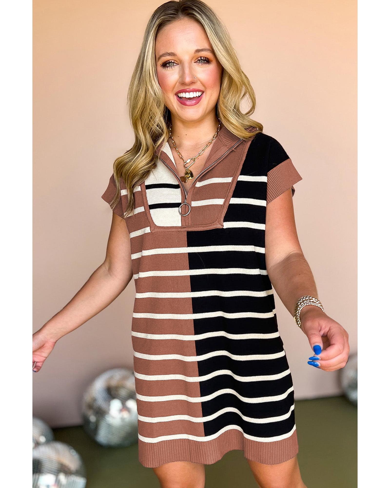 Black Stripe Color Block Quarter Zip Collar Short Sleeve Sweater Dress – S