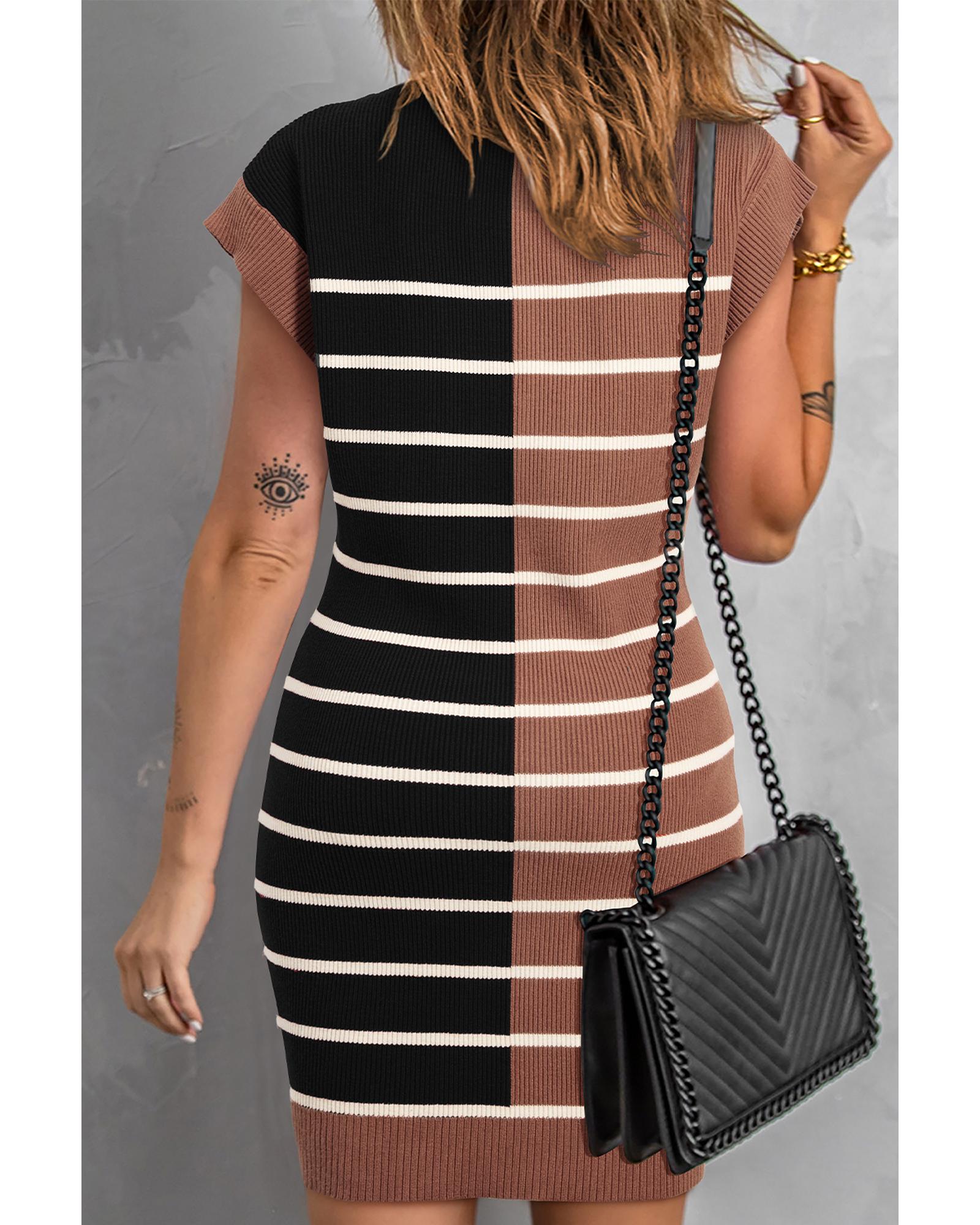 Black Stripe Color Block Quarter Zip Collar Short Sleeve Sweater Dress – XL