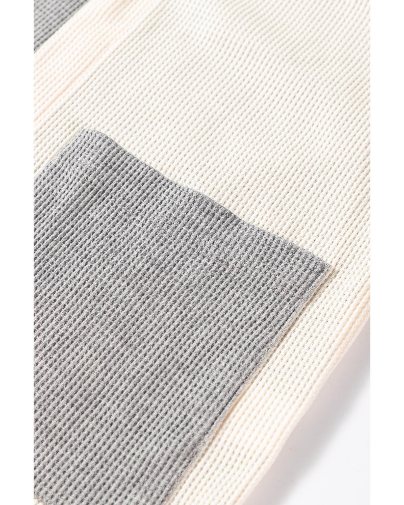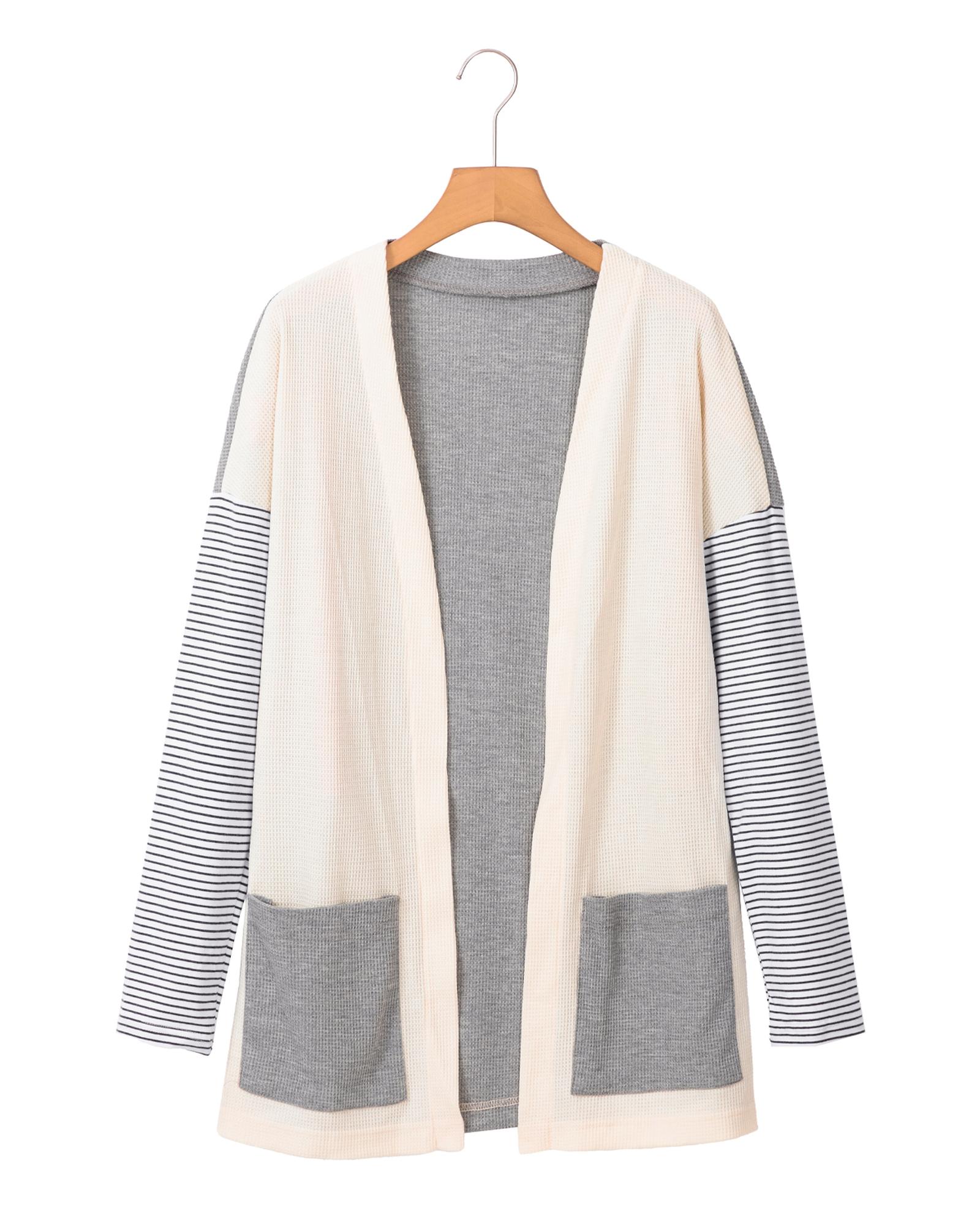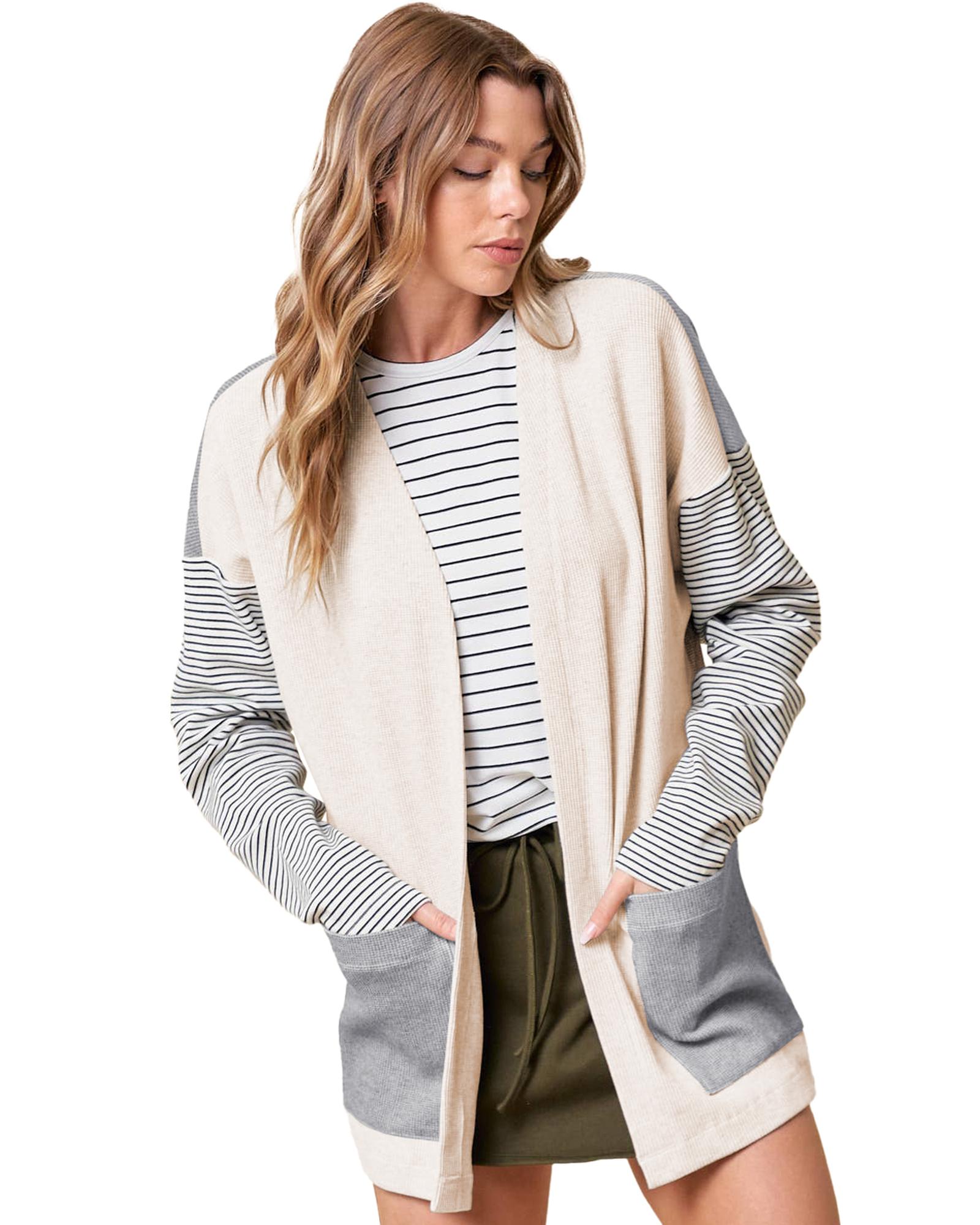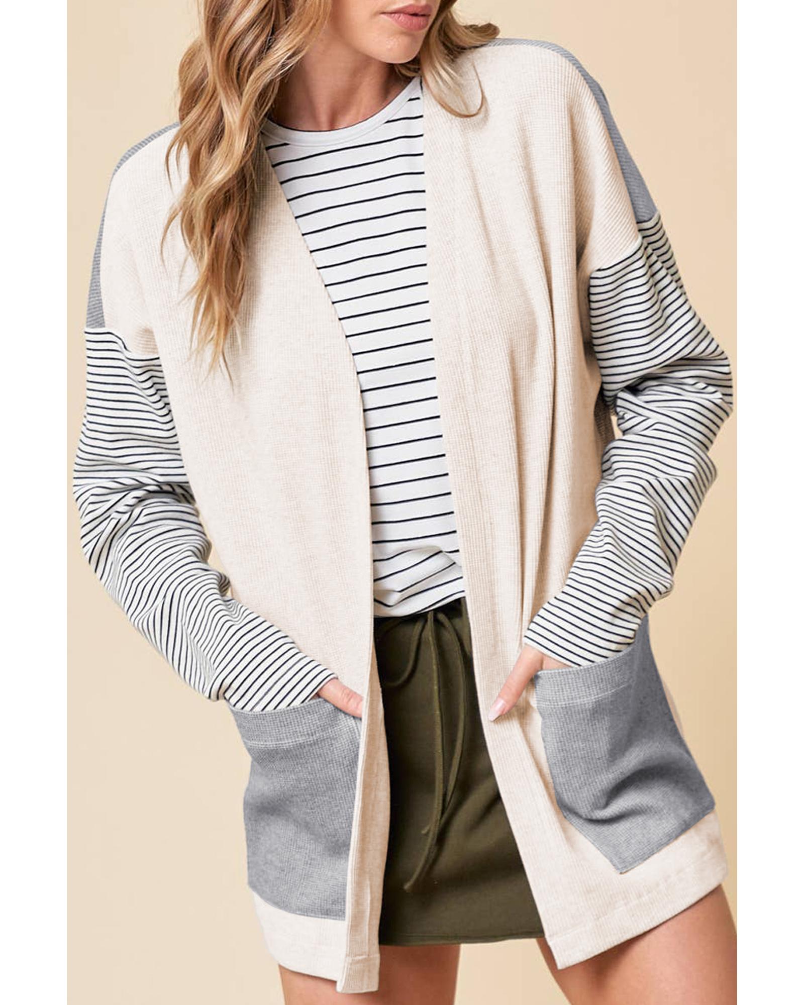 Black Stripe Colorblock Patchwork Open Front Cardigan with Pocket – S
