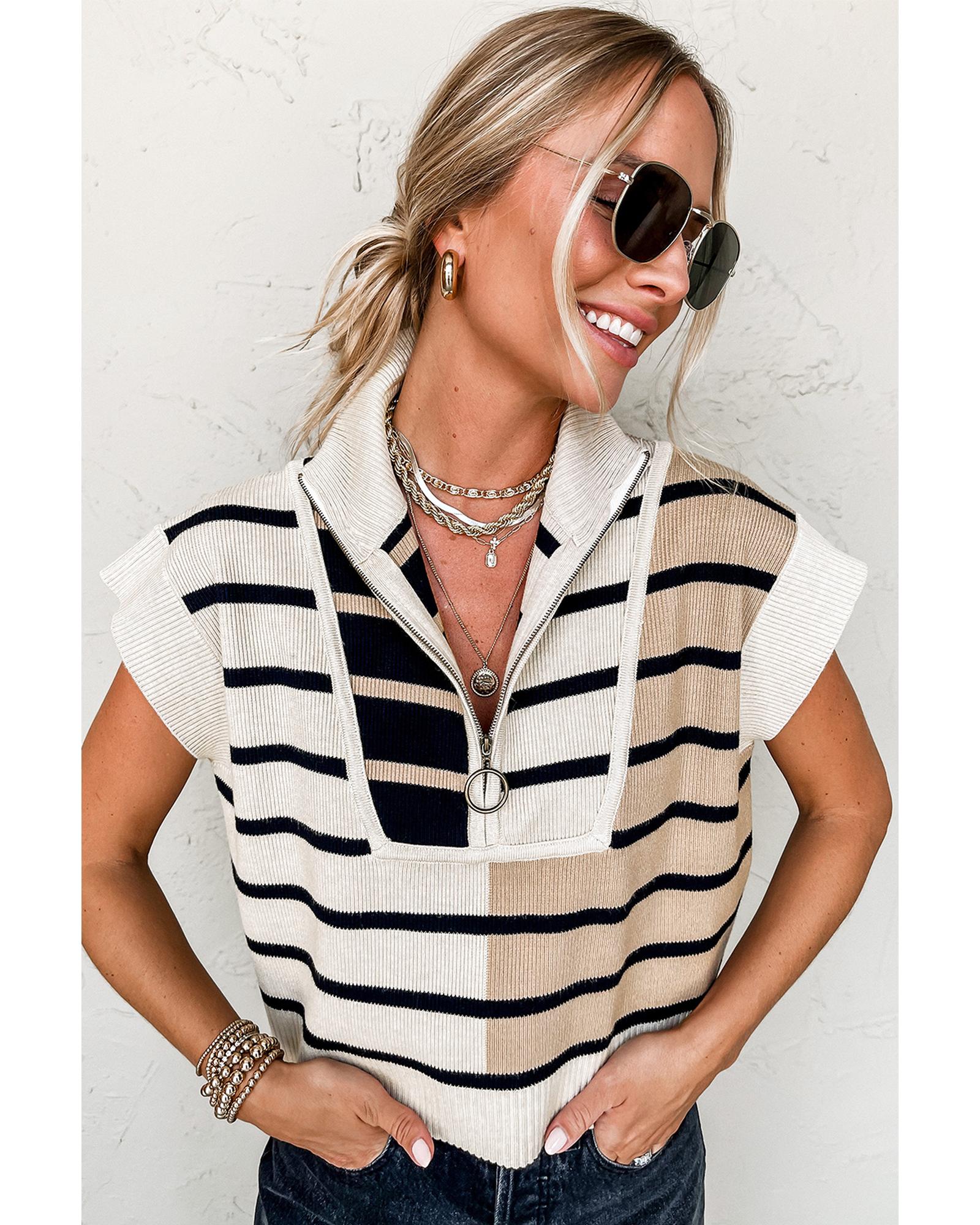 Khaki Stripe Color Block Quarter Zip Collar Short Sleeve Sweater Dress - S Original price was: $76.99.Current price is: $41.99.