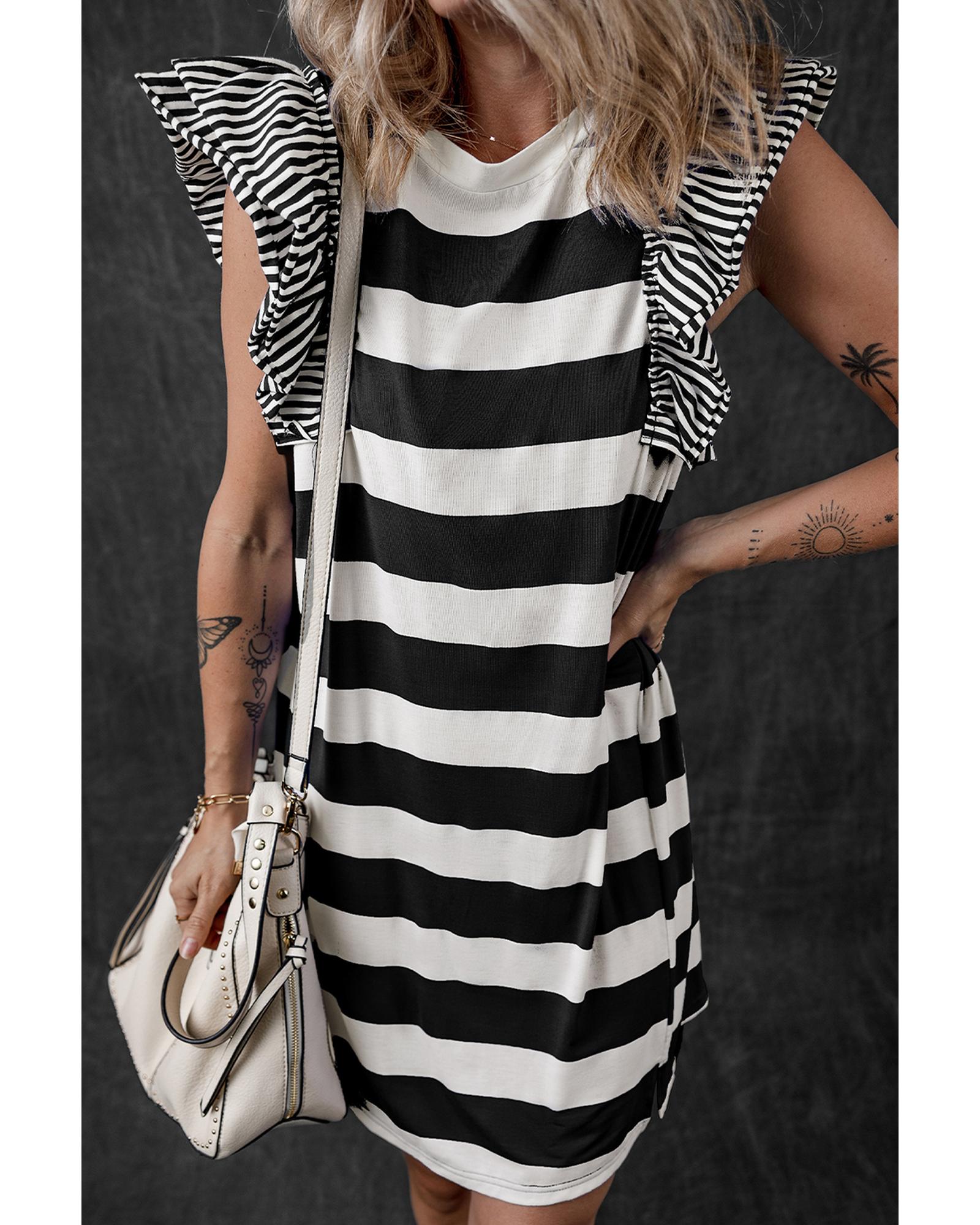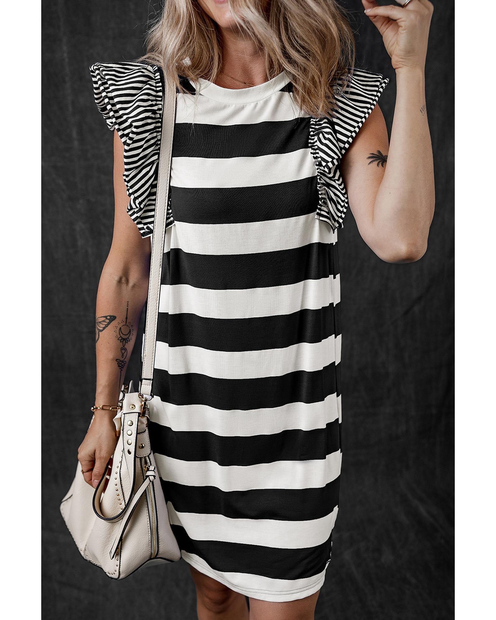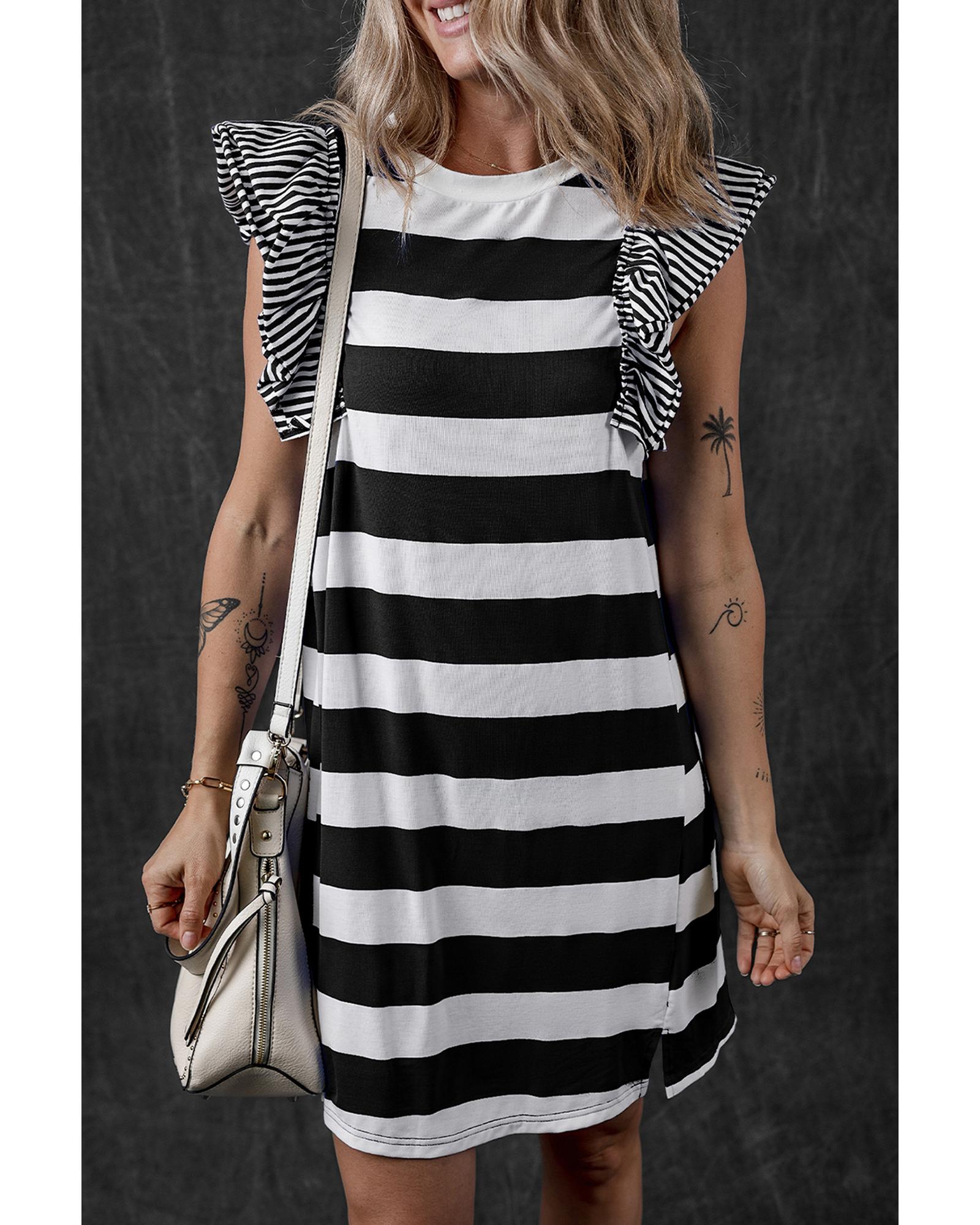 Black Stripe Contrast Ruffled Sleeve T-shirt Dress – S