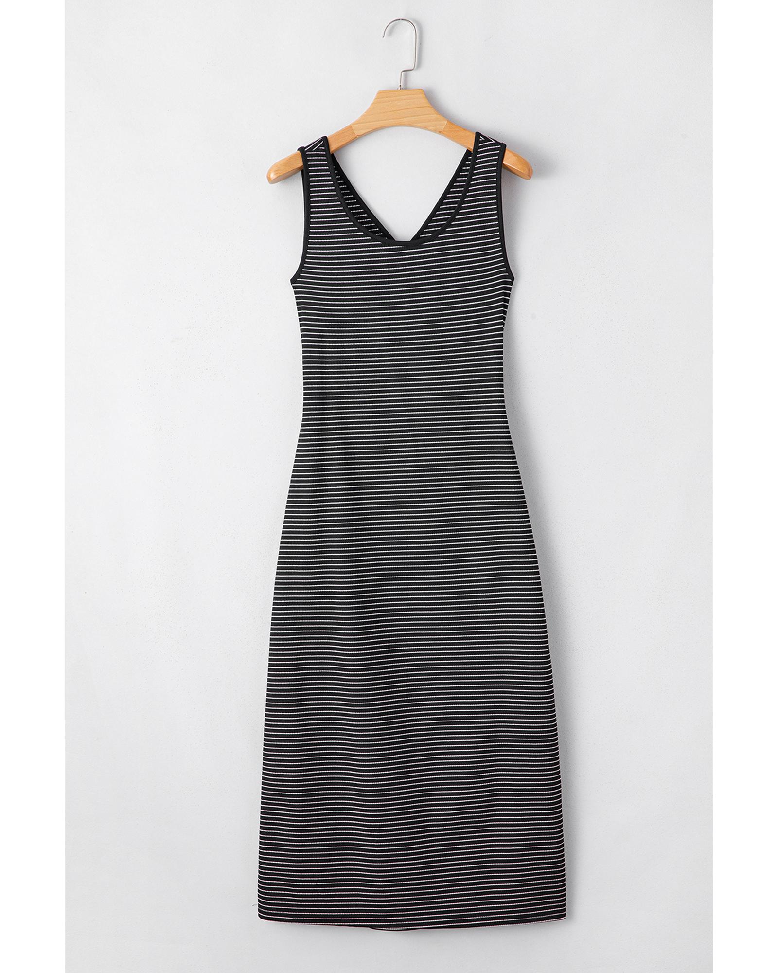 Black Stripe Criss Cross Side Slits Slim Fit Sleeveless Midi Dress – L