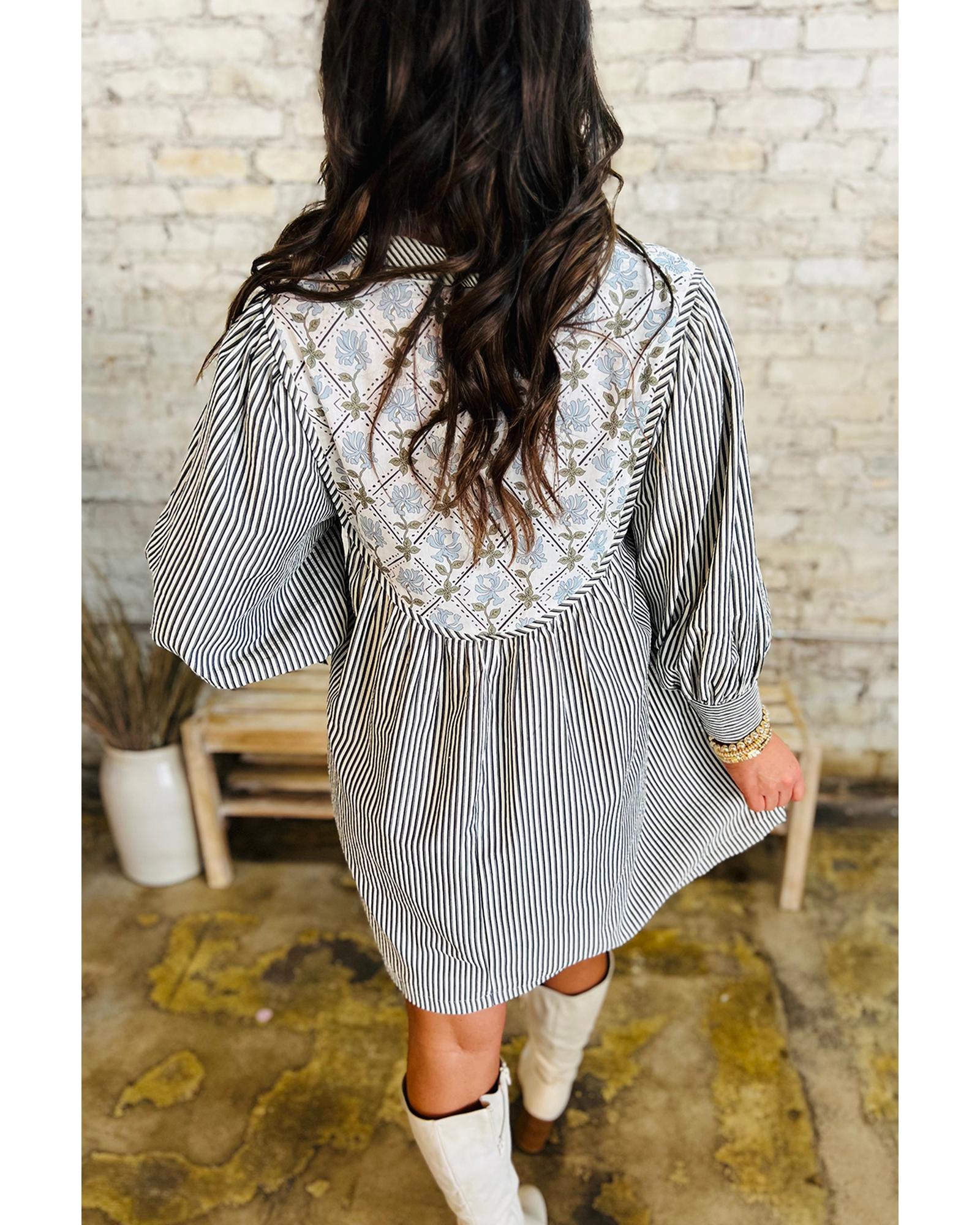 Black Stripe Floral Patchwork Tied V Neck Shift Long Sleeve Mini Dress – L
