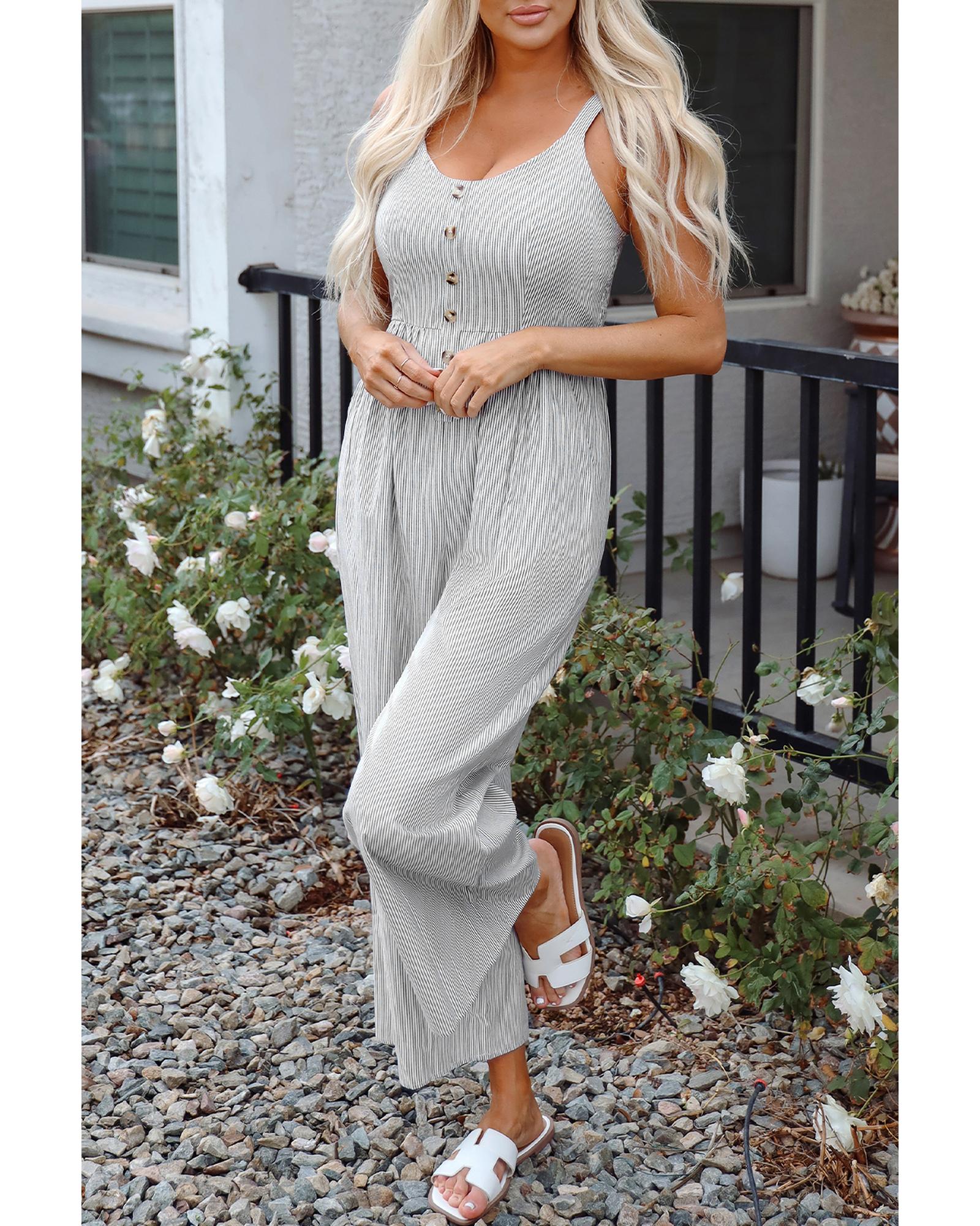 Black Stripe Half Buttoned Sleeveless Wide Leg Jumpsuit – S