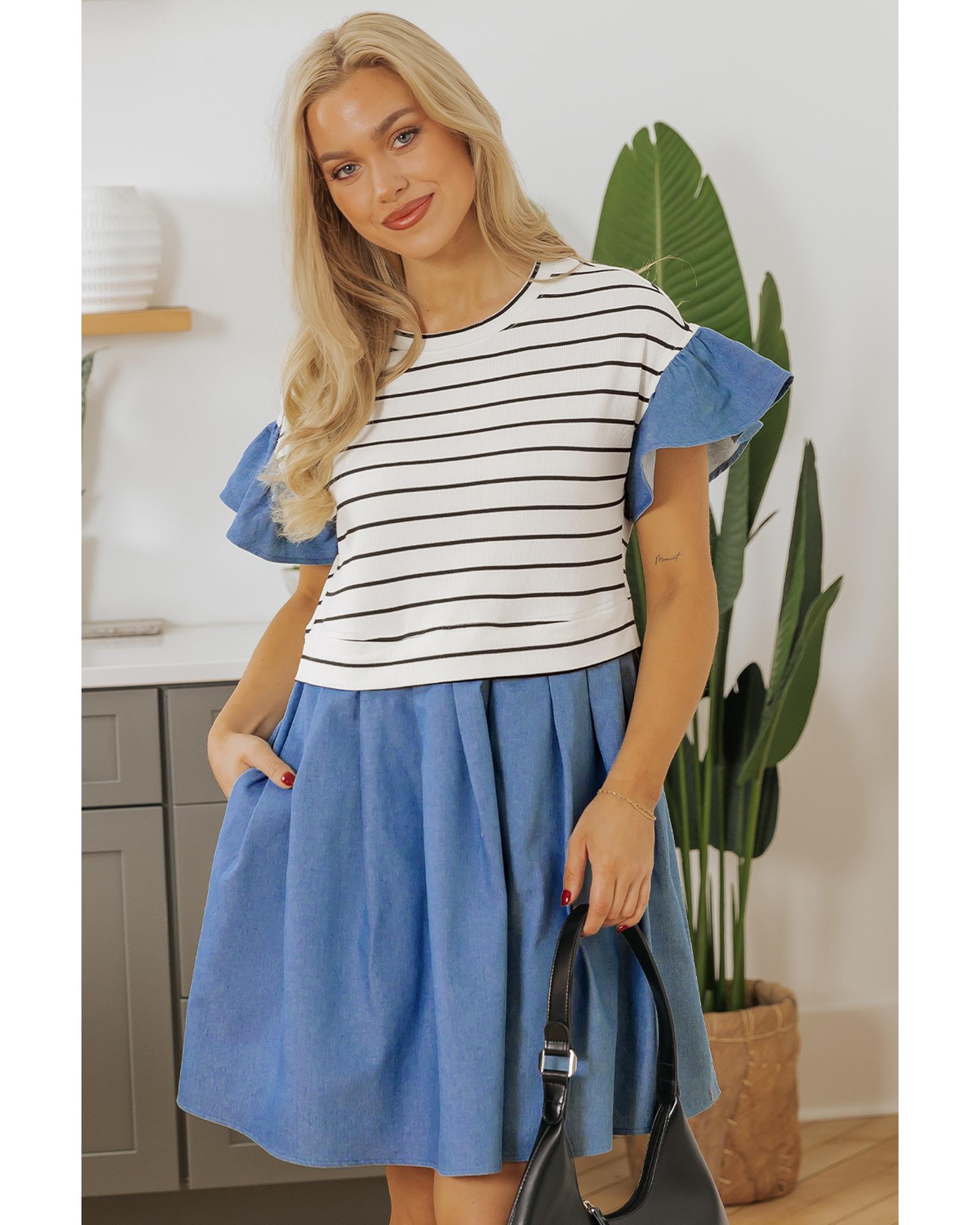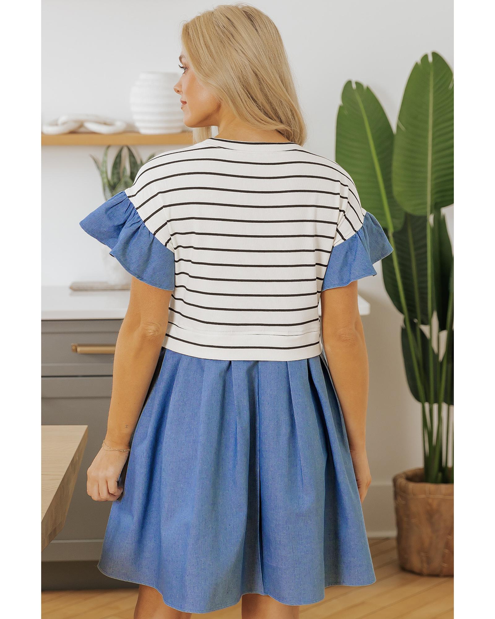 Black Stripe Ruffle Denim Patchwork Round Neck Mini Dress – L