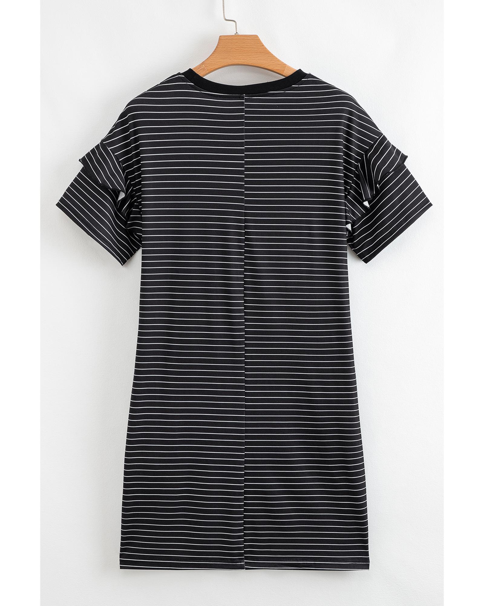 Black Stripe Ruffled Short Sleeve Crew Neck T Shirt Shift Mini Dress – L