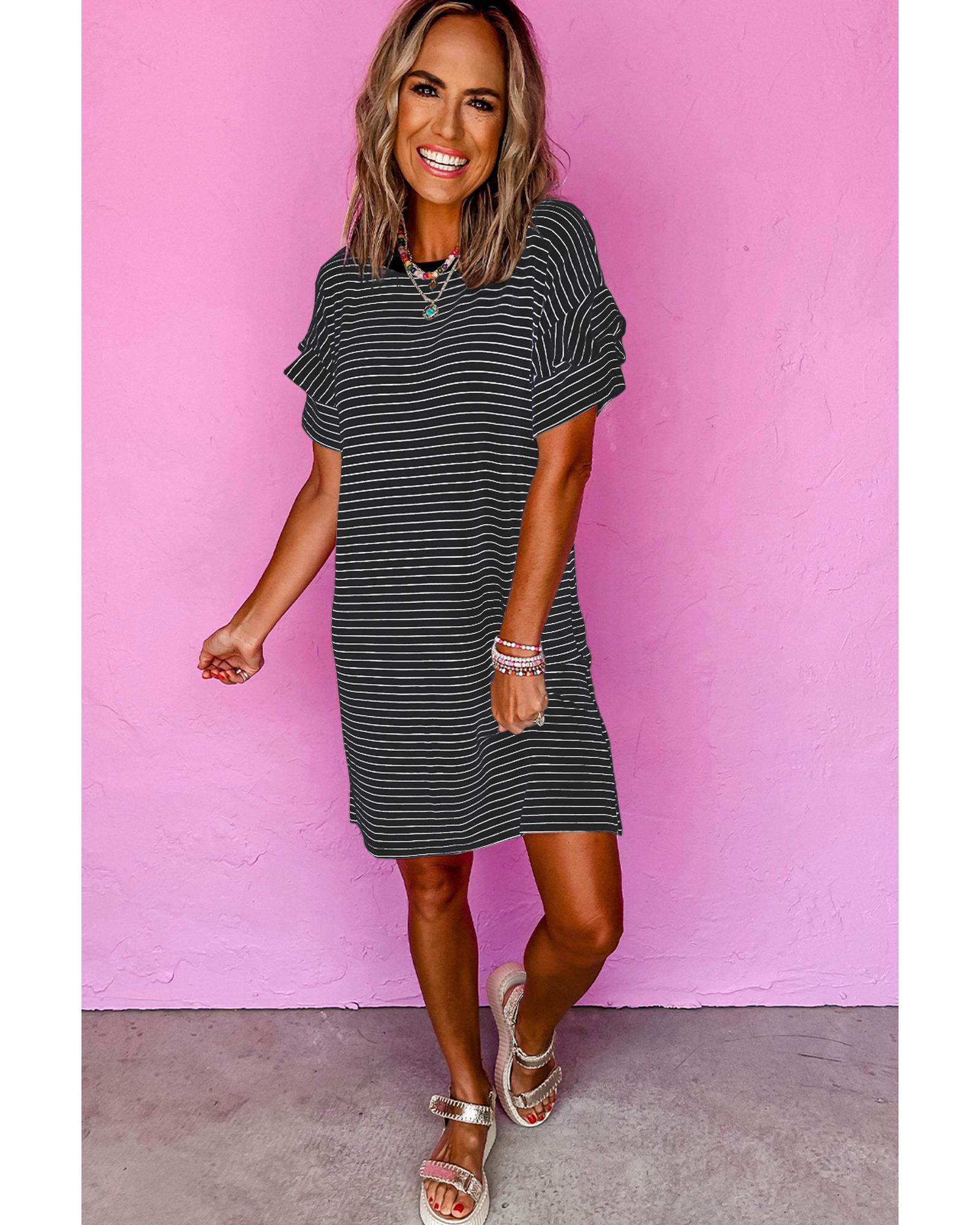 Black Stripe Ruffled Short Sleeve Crew Neck T Shirt Shift Mini Dress – XL
