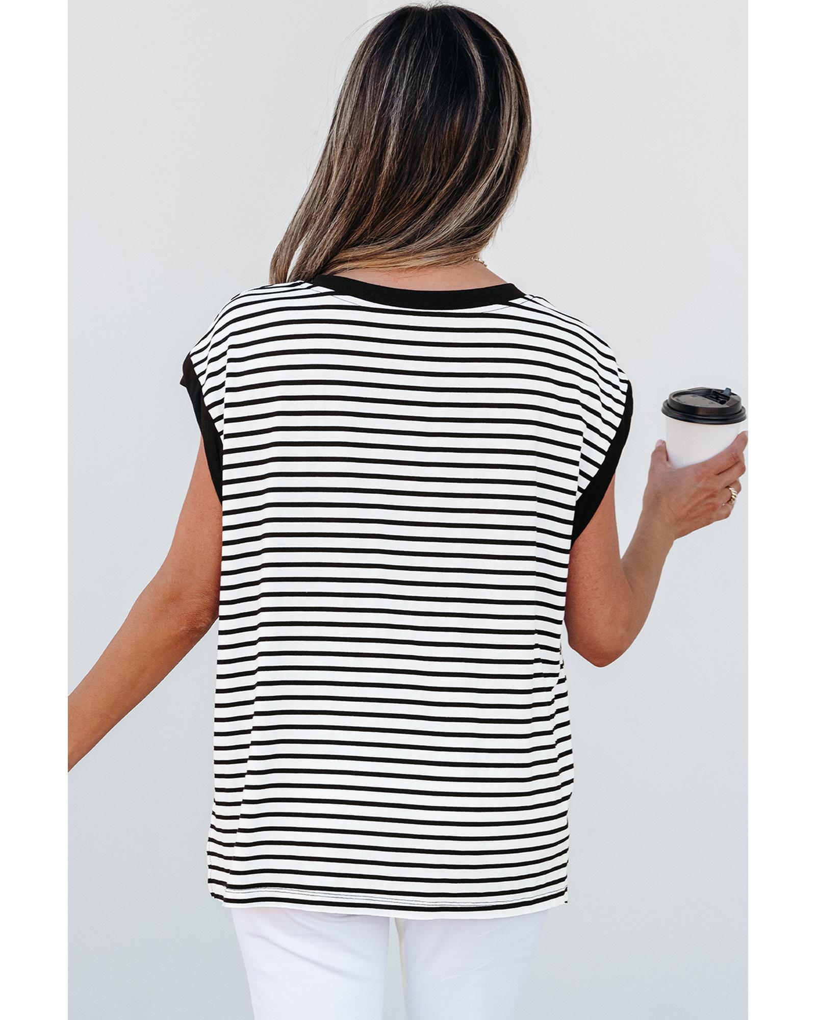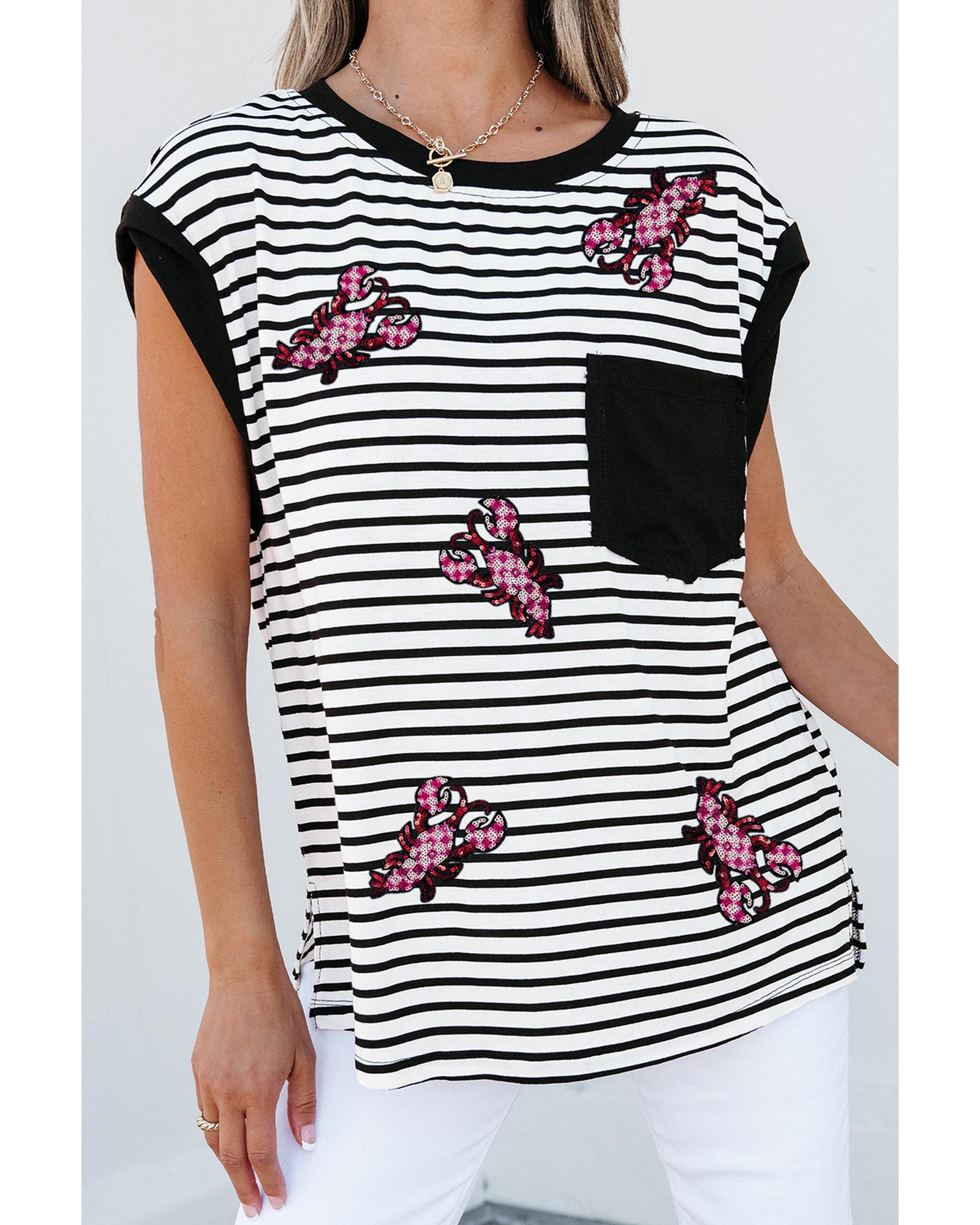 Black Stripe Sequined Lobster Patched Pocket Casual Tank Top – S