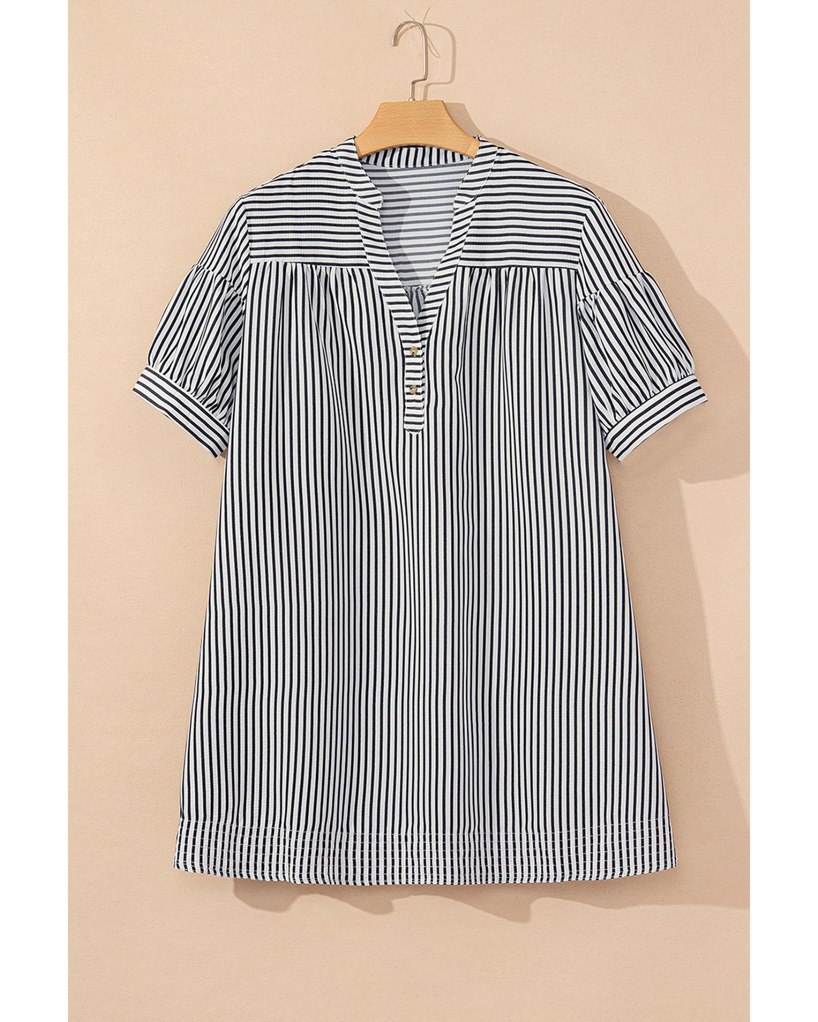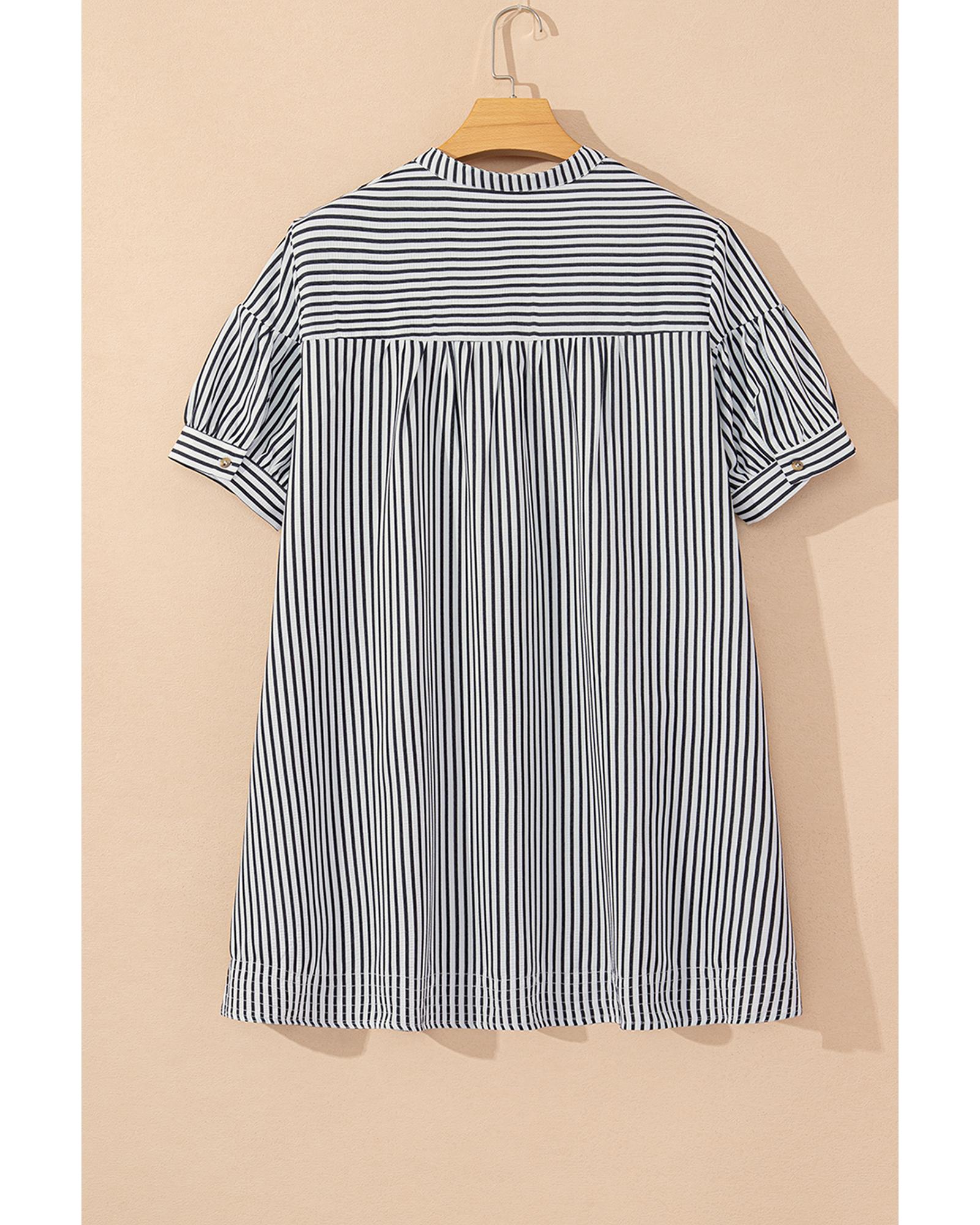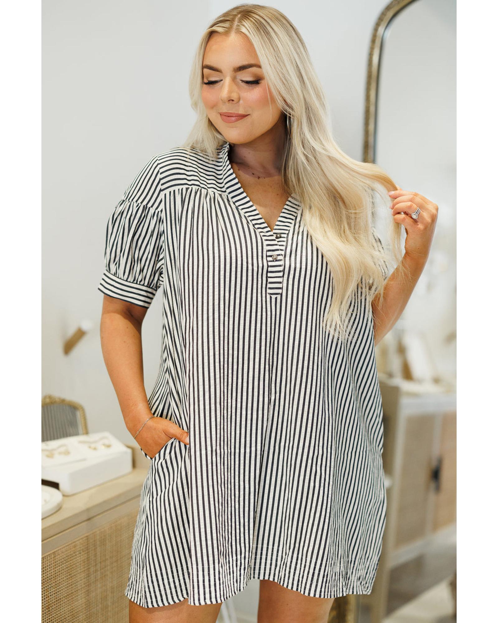 Black Stripe Short Sleeve Buttoned V Neck Pocketed Plus Size Mini Dress – 3X