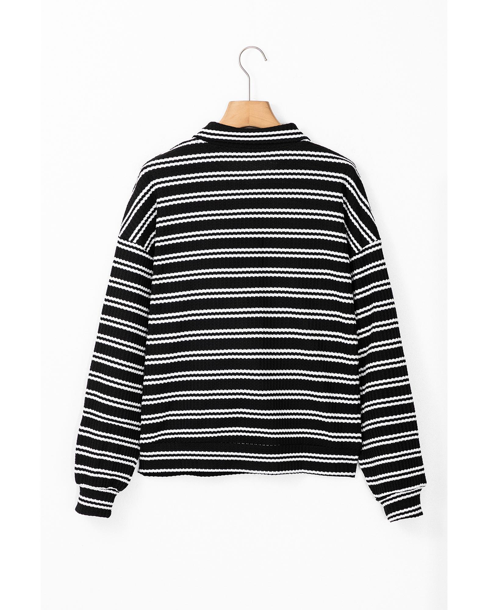 Black Stripe Textured Quarter Zip Collar Long Sleeve Top – M