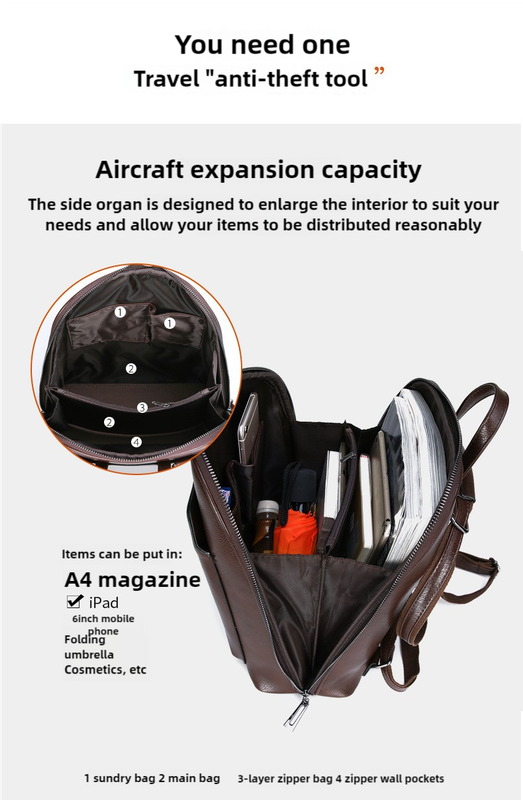 - Capacity: Designed with spacious compartments for A4 magazines, iPad, mobile phones, folding umbrellas, and cosmetics.