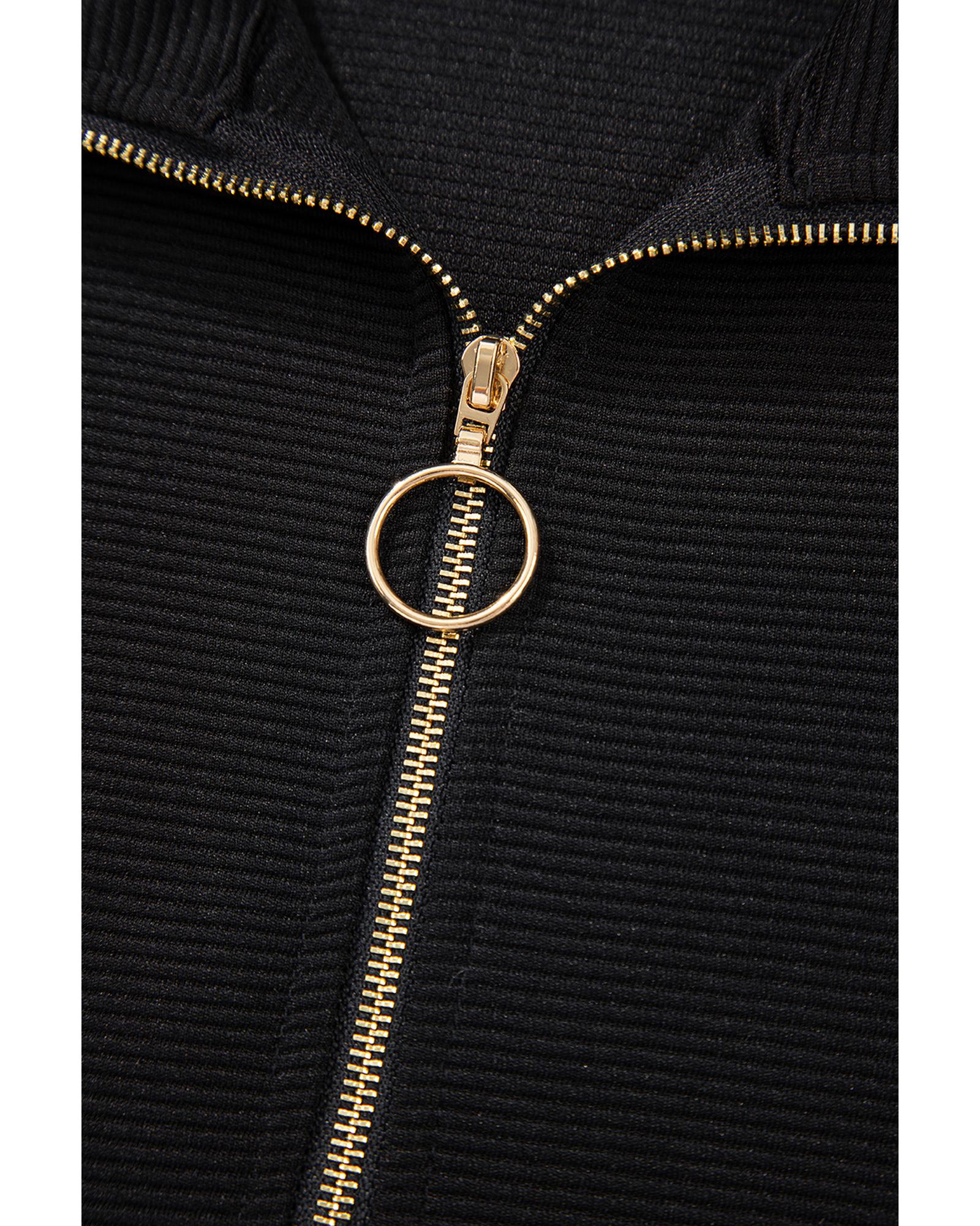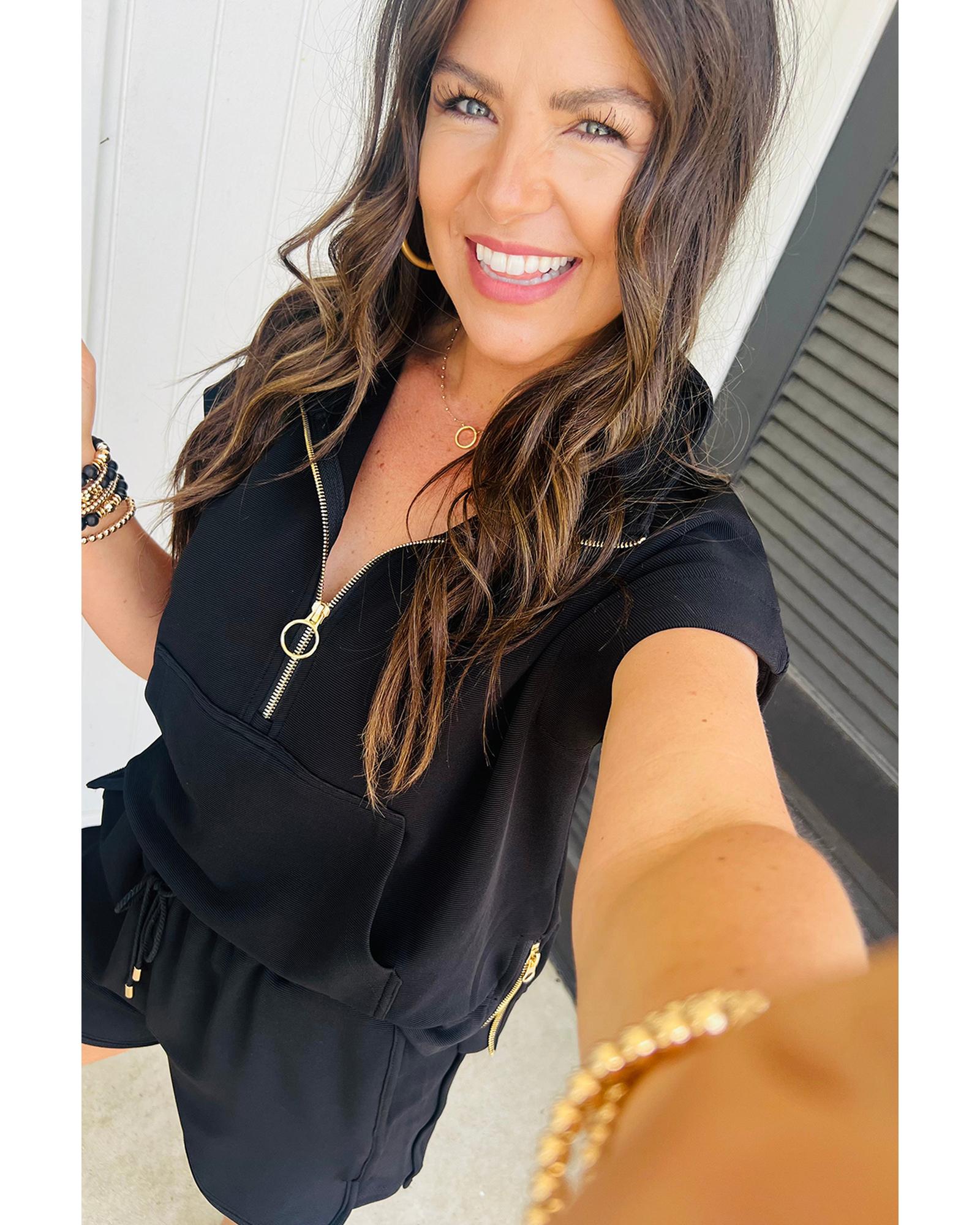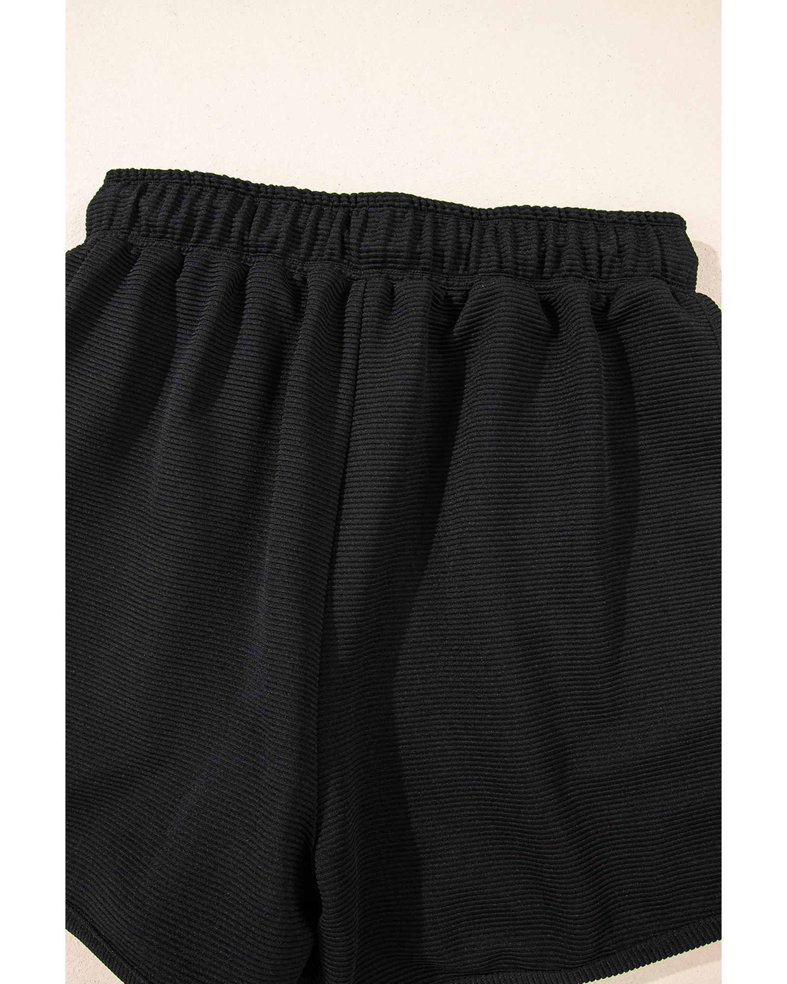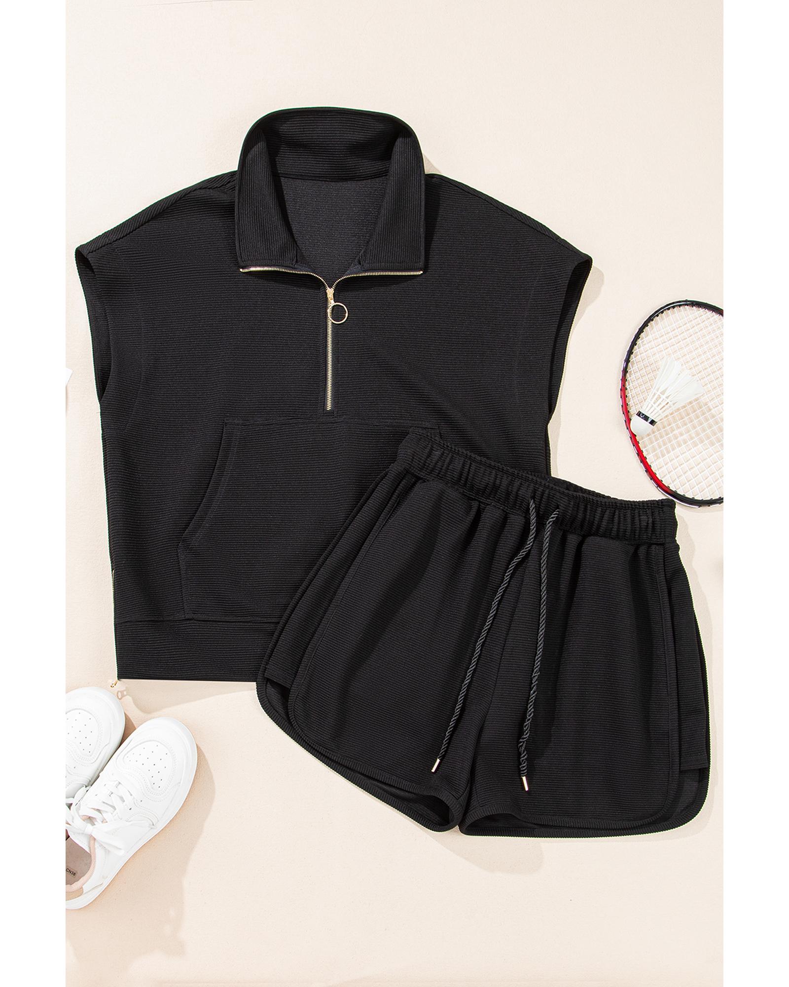 Black Textured Half Zip Kangaroo Pocket Top Drawstring Shorts Set – L