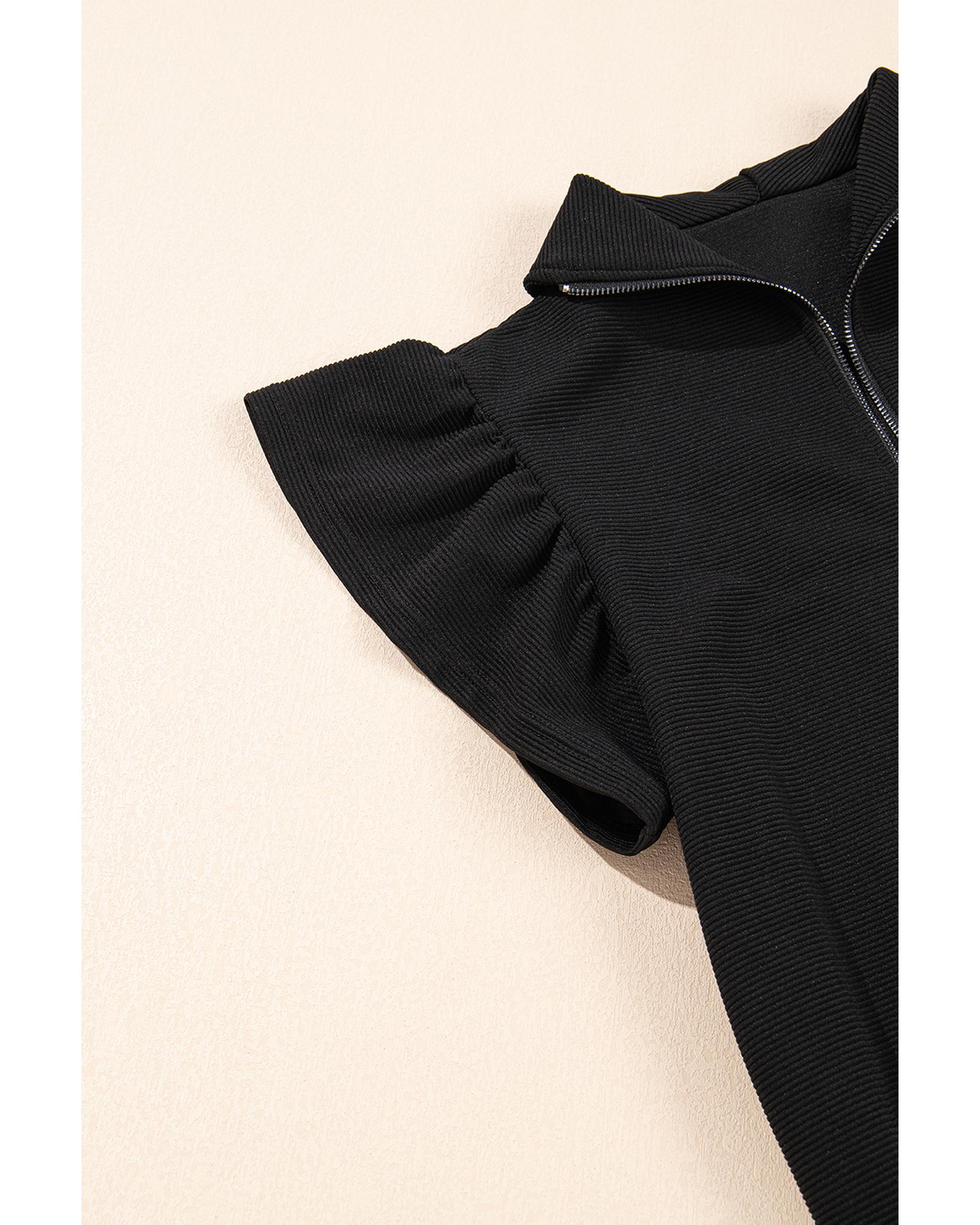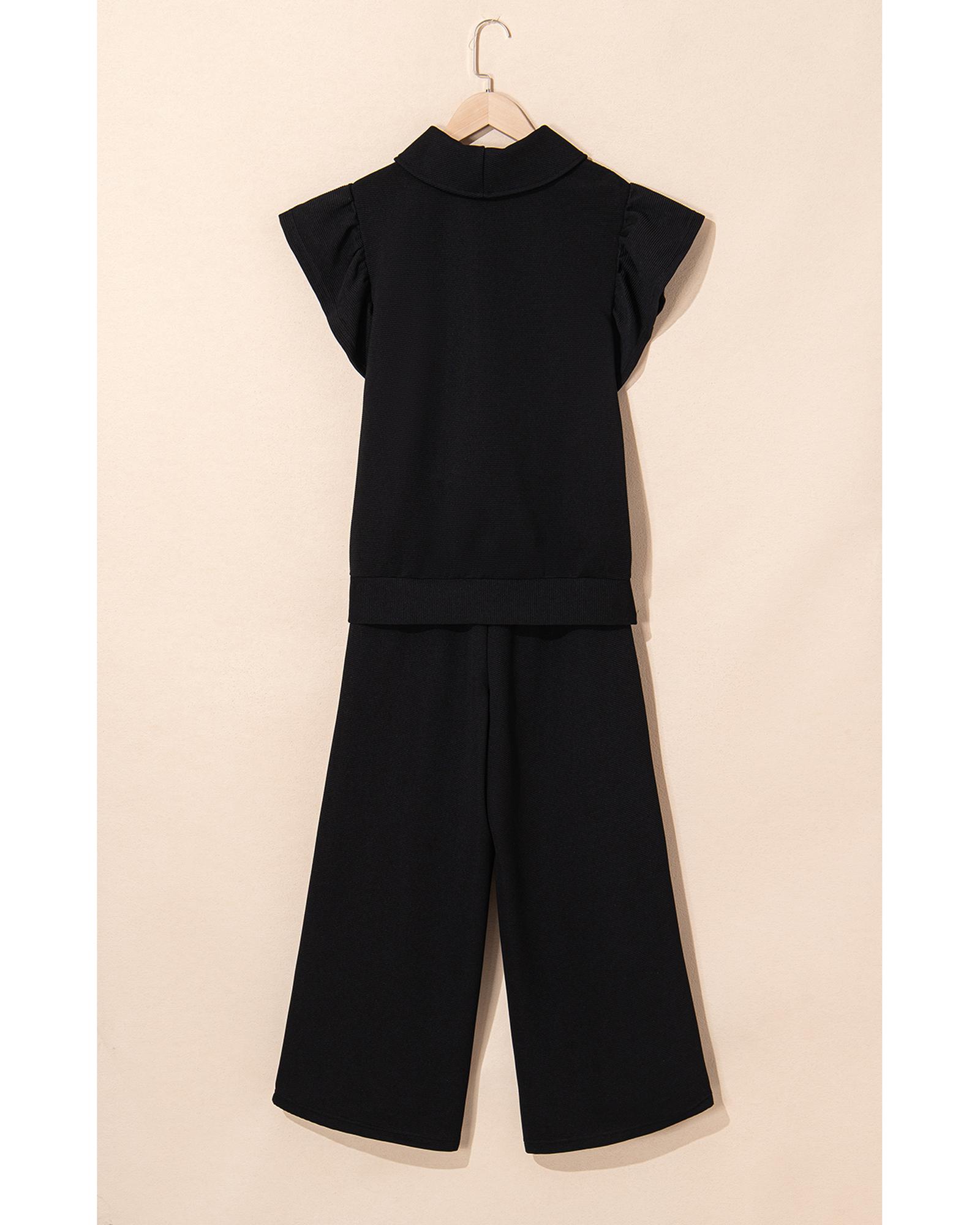 • Black Textured Ruffled Sleeve Zipped Top and Wide Leg Pants Set