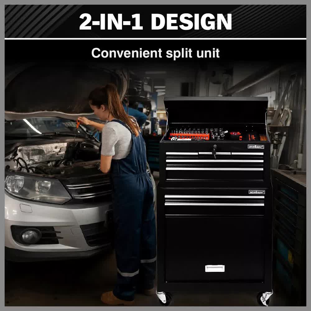 The HORUSDY 7-Drawer Tool Box Chest Cabinet is a versatile storage solution made of durable powder-coated steel. With its 2-in-1 detachable and combinable design, the upper and lower cabinets can be separated or combined as needed, saving space and enabling easy transportation. Each drawer features smooth ball-bearing slides and is lined with non-slip protective liners to keep your tools secure. The tool trolley is equipped with swivel castors, including 3″ brake castors for easy maneuverability on slopes. It offers ample storage space, sturdy construction, and premium cam locks with keys for added security.