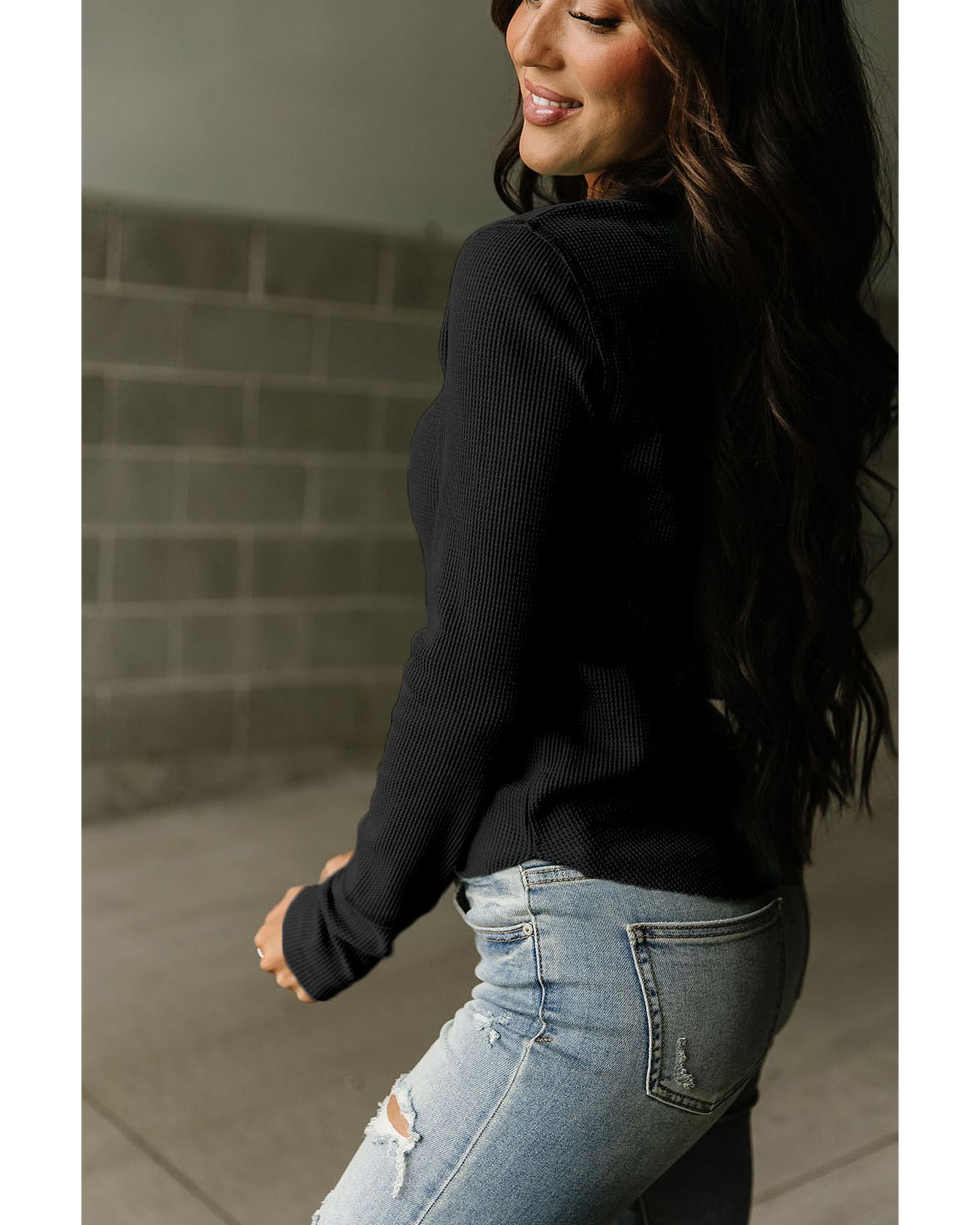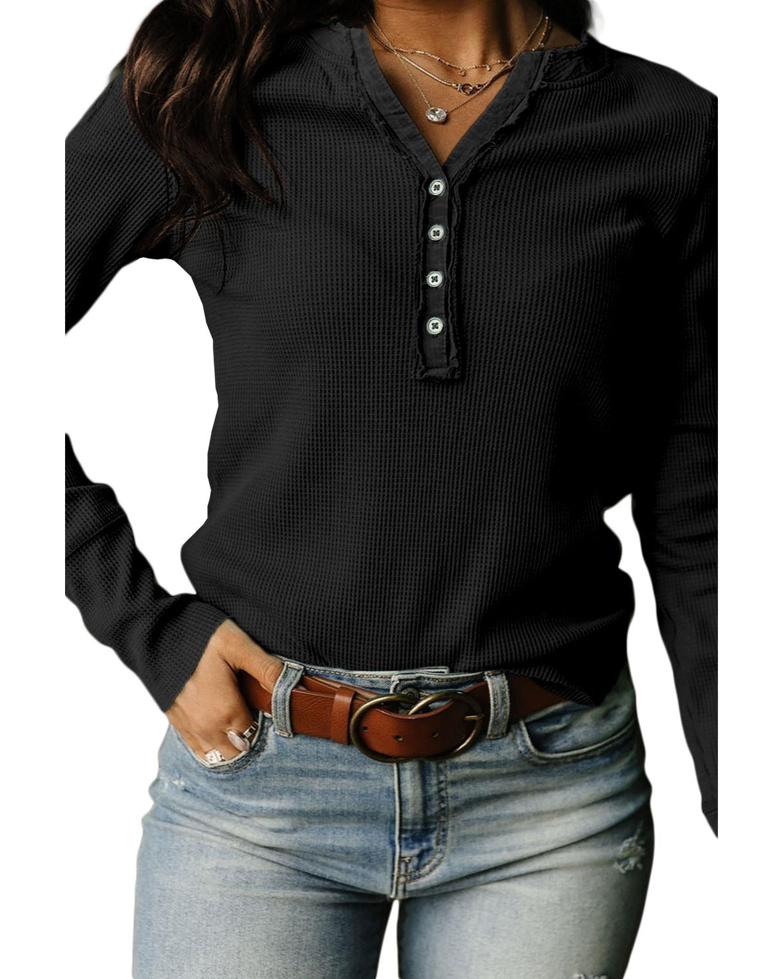 Black Trimmed Neckline Waffle Knit Henley Top – S