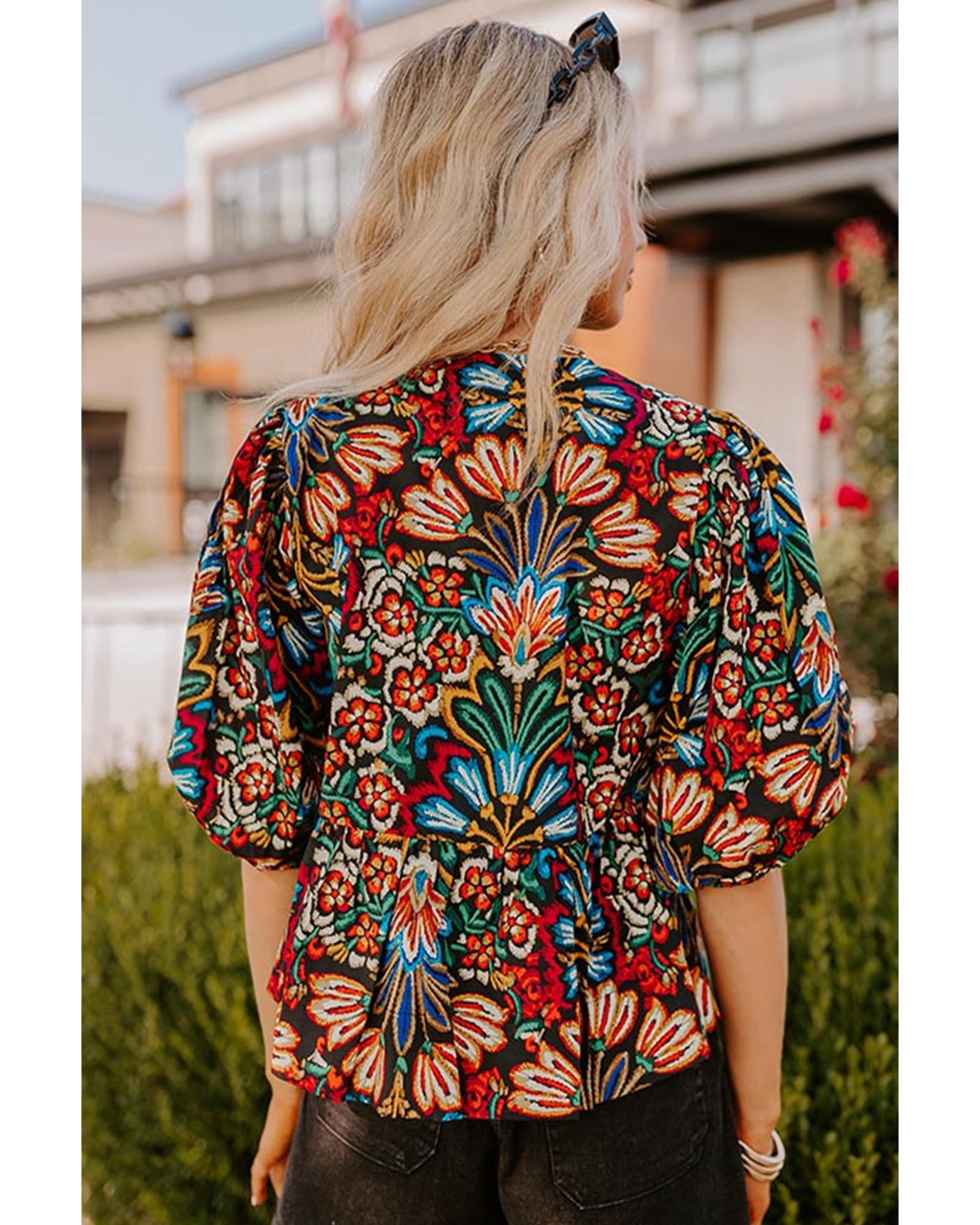 - Tropical print adds a touch of exotic flair to the blouse
