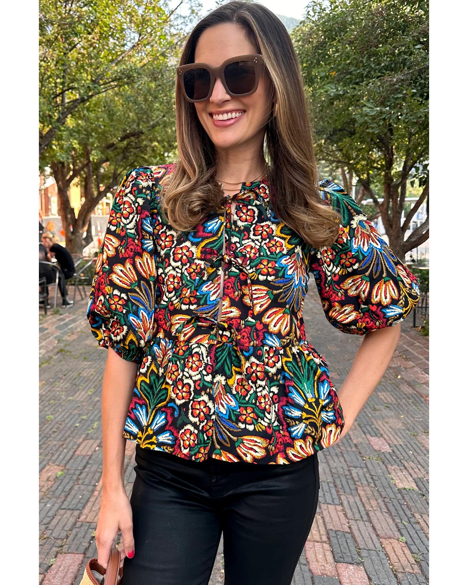 Black Tropical Print Bubble Sleeve Knot Front Blouse – XL