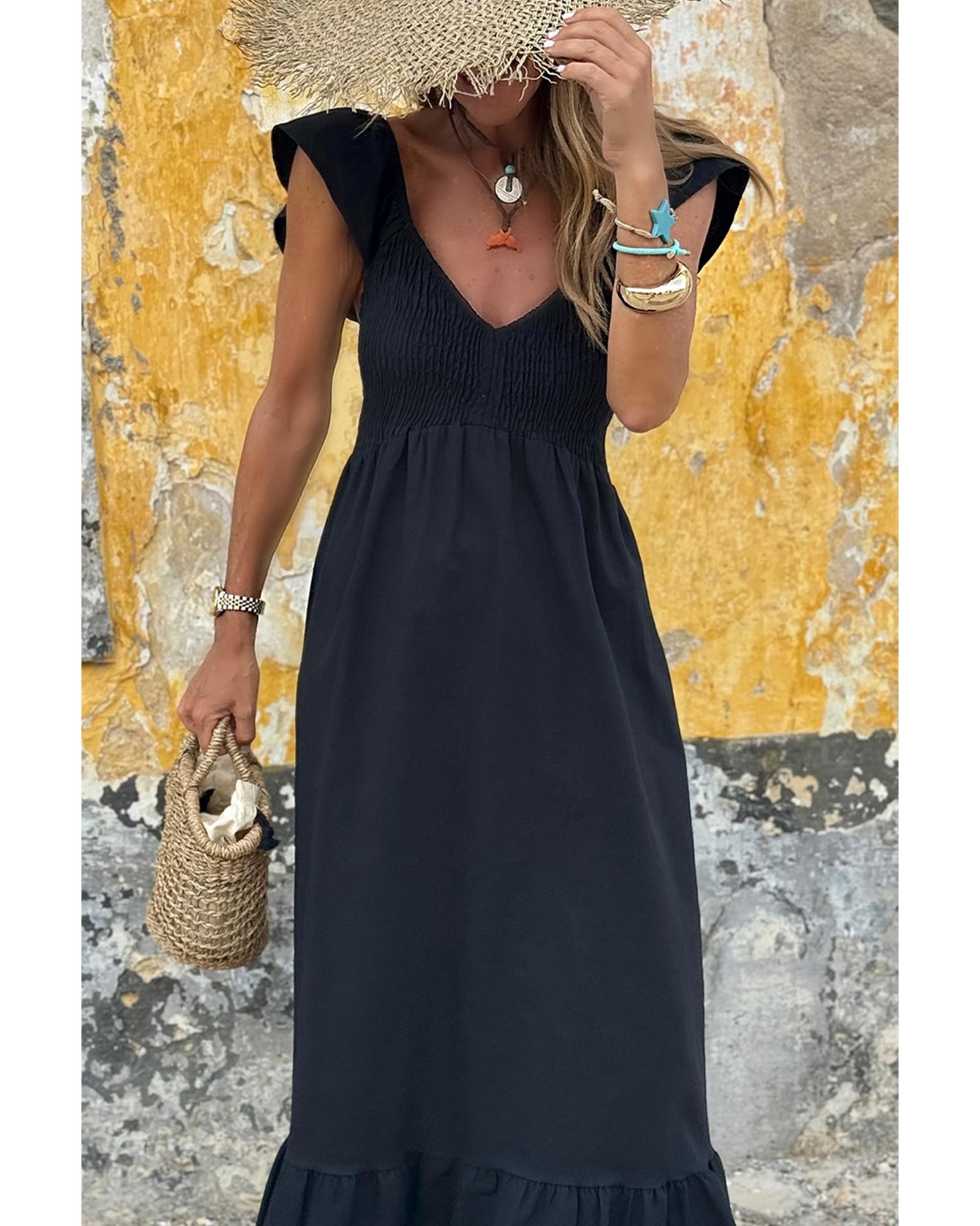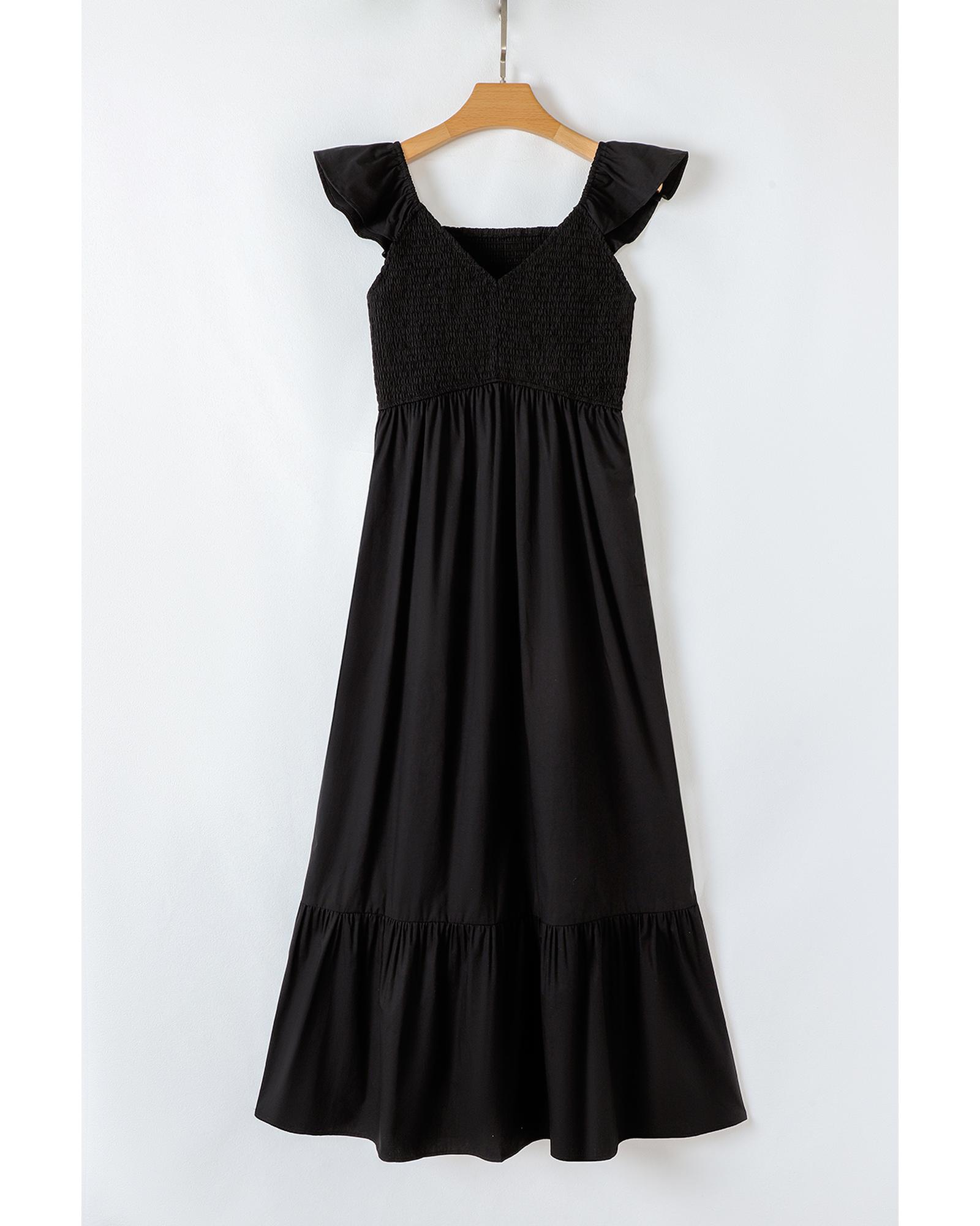 Black V Neck Flutter Sleeve Smocked Bodice High Waist Ruffle Maxi Dress – L