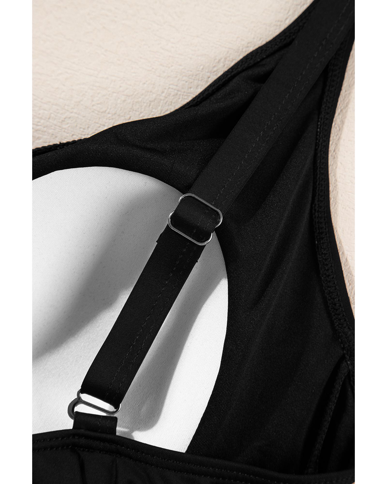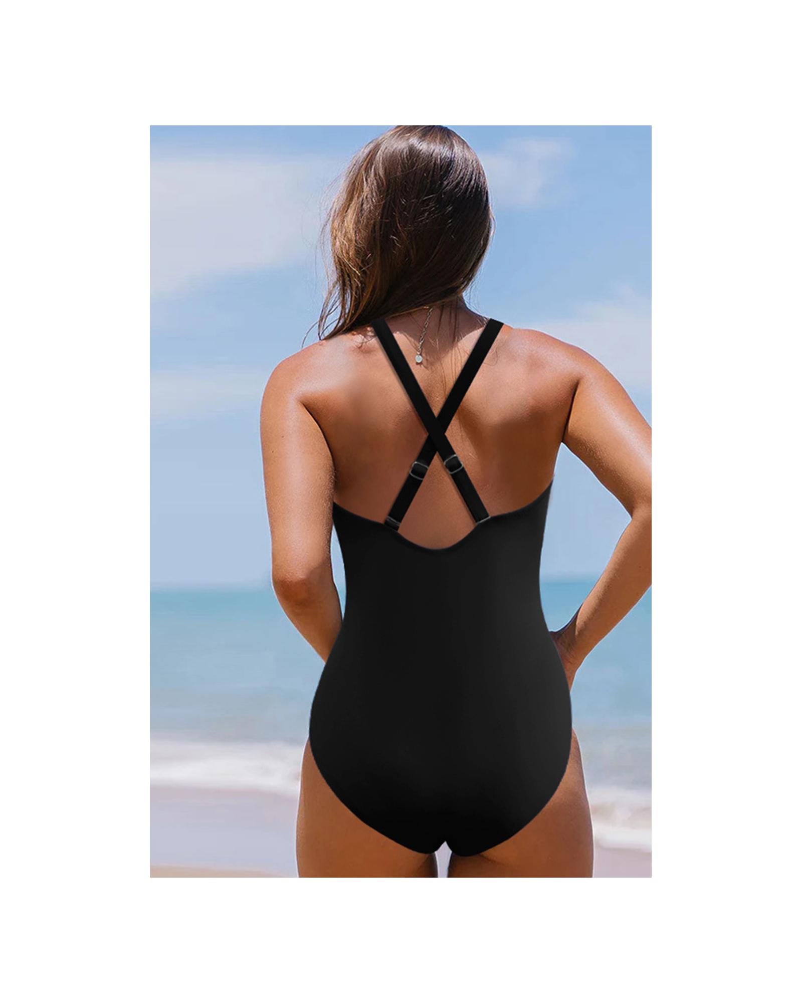 Black V Neck Twist Ruched Crisscross Backless One-Piece Swimsuit – S