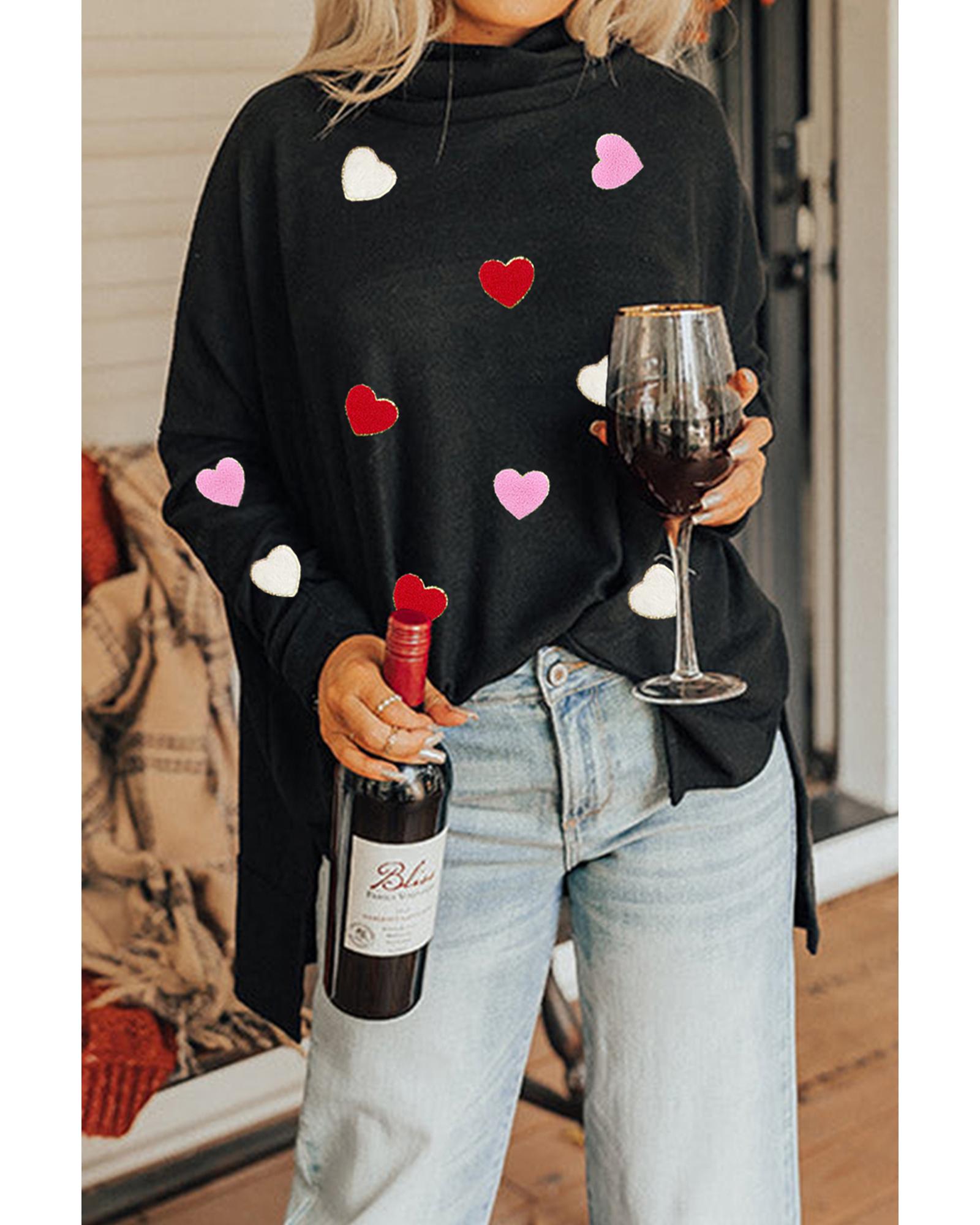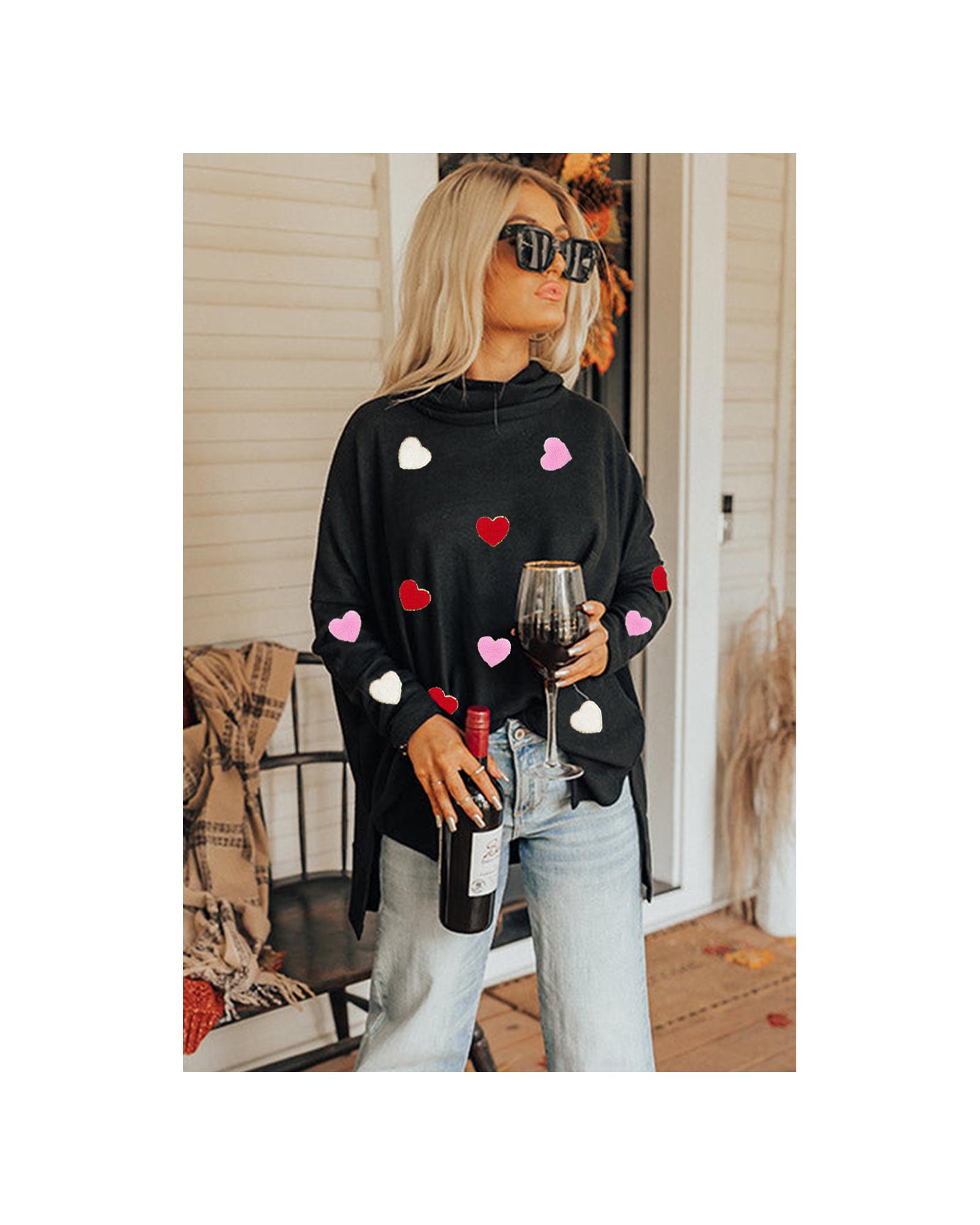 - Black Valentines Chenille Heart Patched Dolman Sleeve High Neck Split Top
