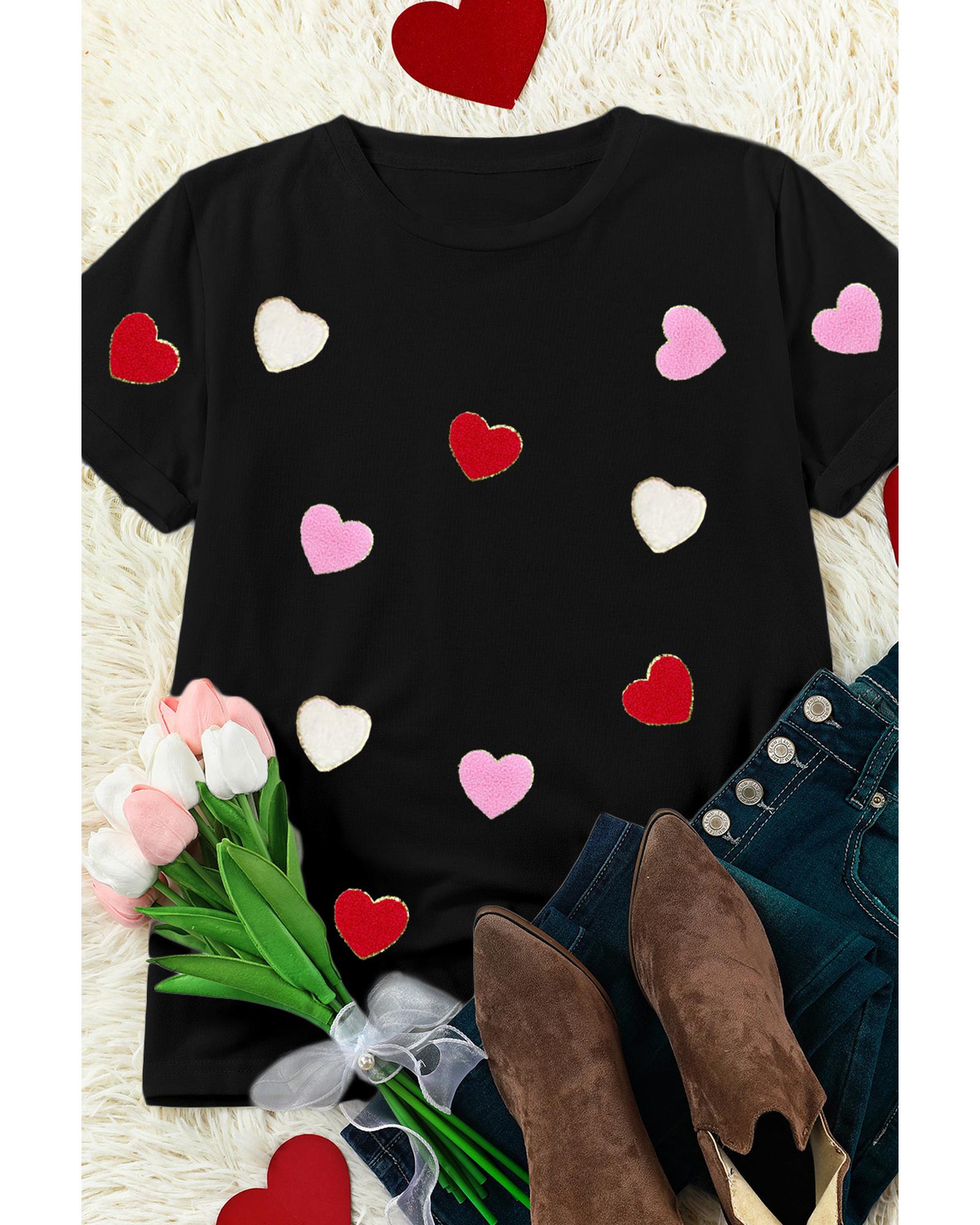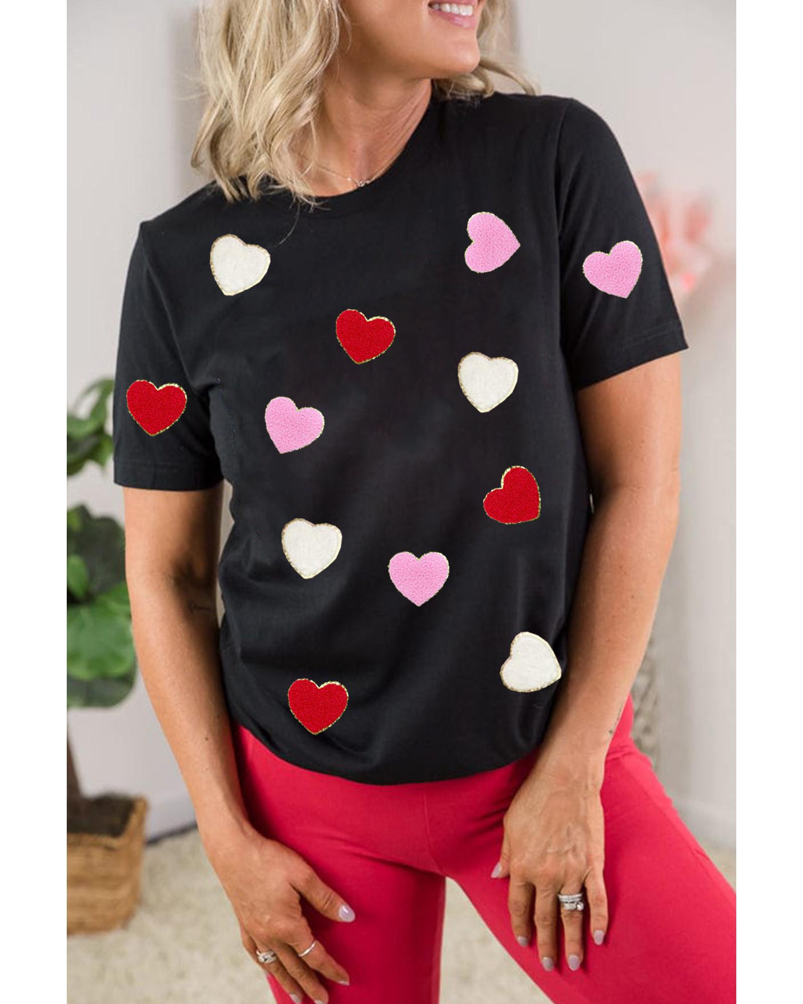 Black Valentines Chenille Heart Patched Pattern Crewneck Tee – L