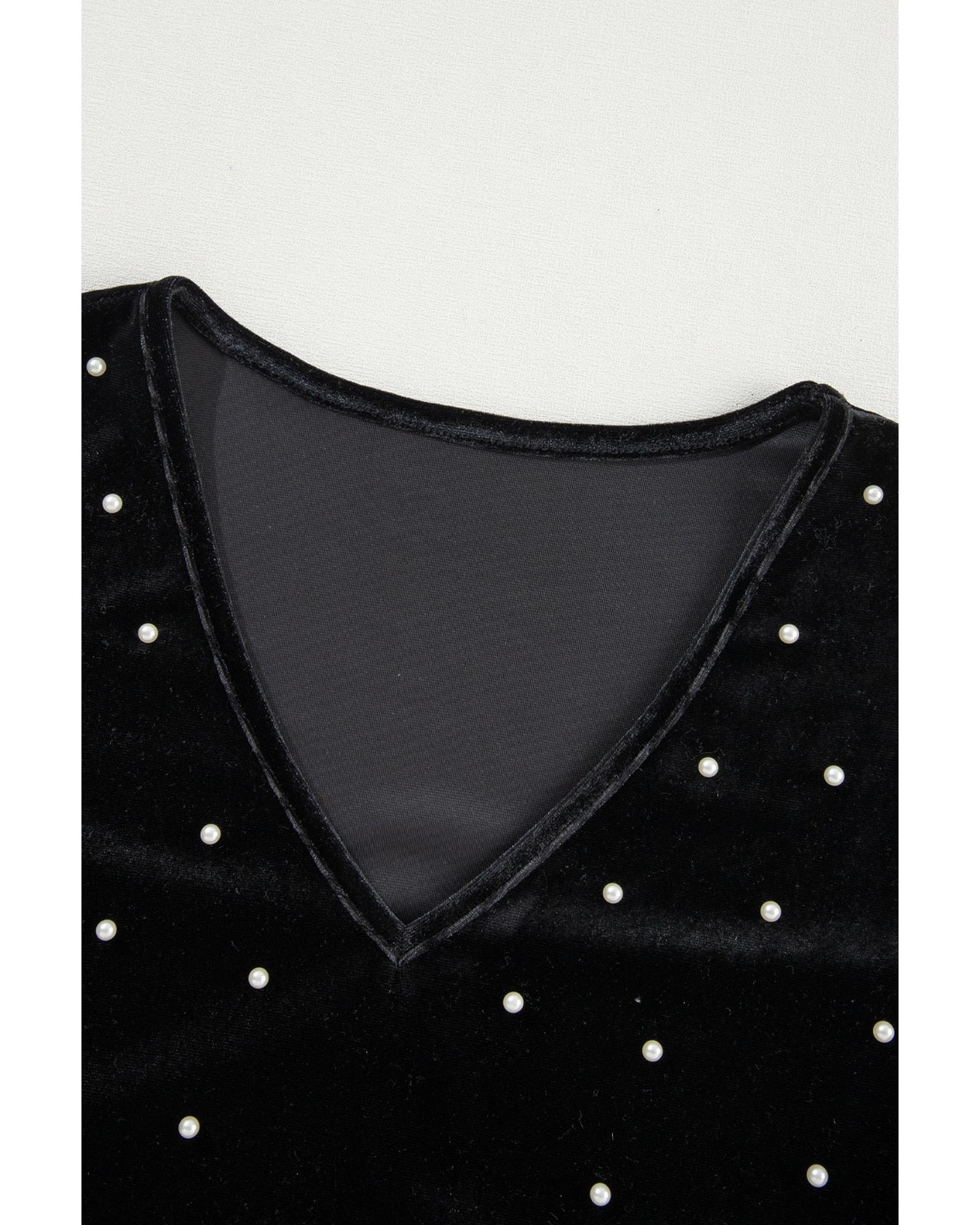Black Velvet Beaded Long Sleeve V Neck Bodysuit – L