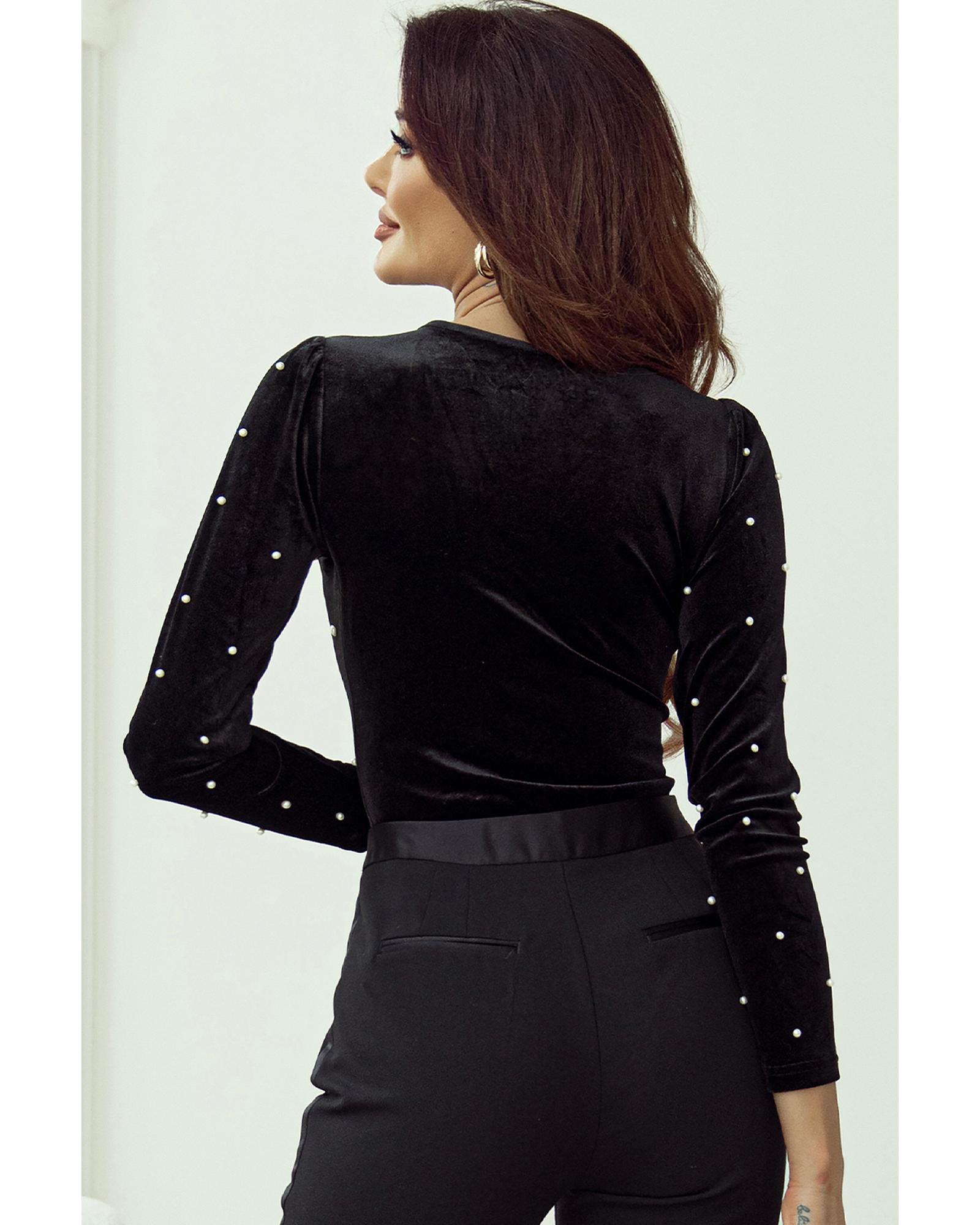 Black Velvet Beaded Long Sleeve V Neck Bodysuit – M