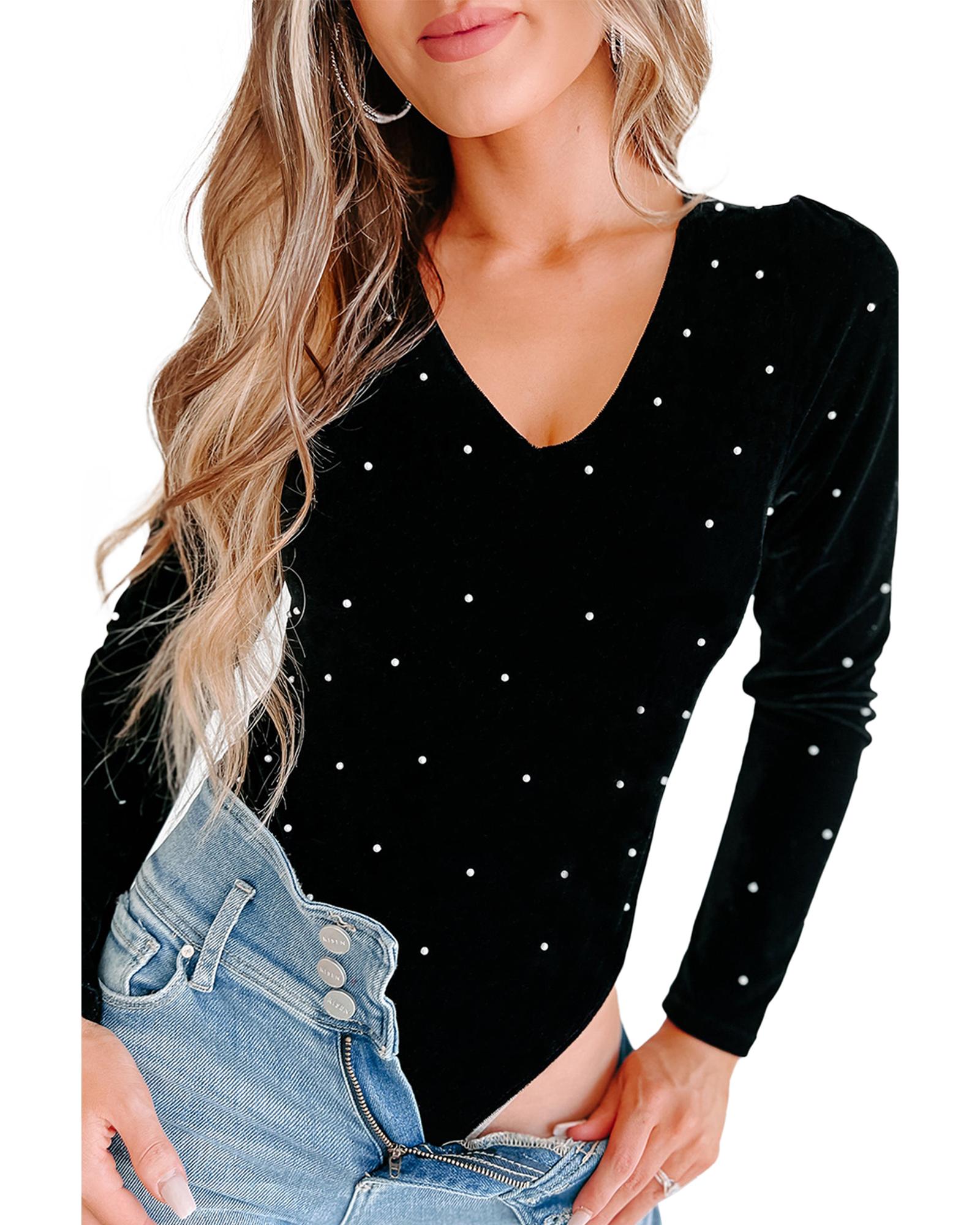 Black Velvet Beaded Long Sleeve V Neck Bodysuit – S
