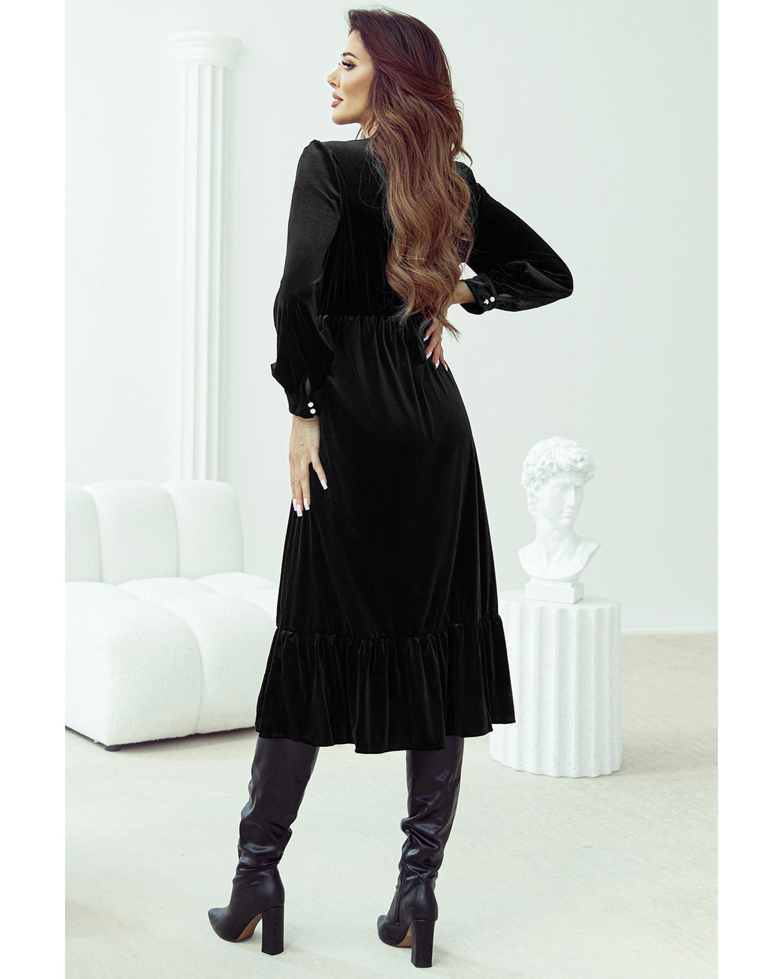Black Velvet Buttoned Puff Sleeve V Neck Split Midi Dress – XL