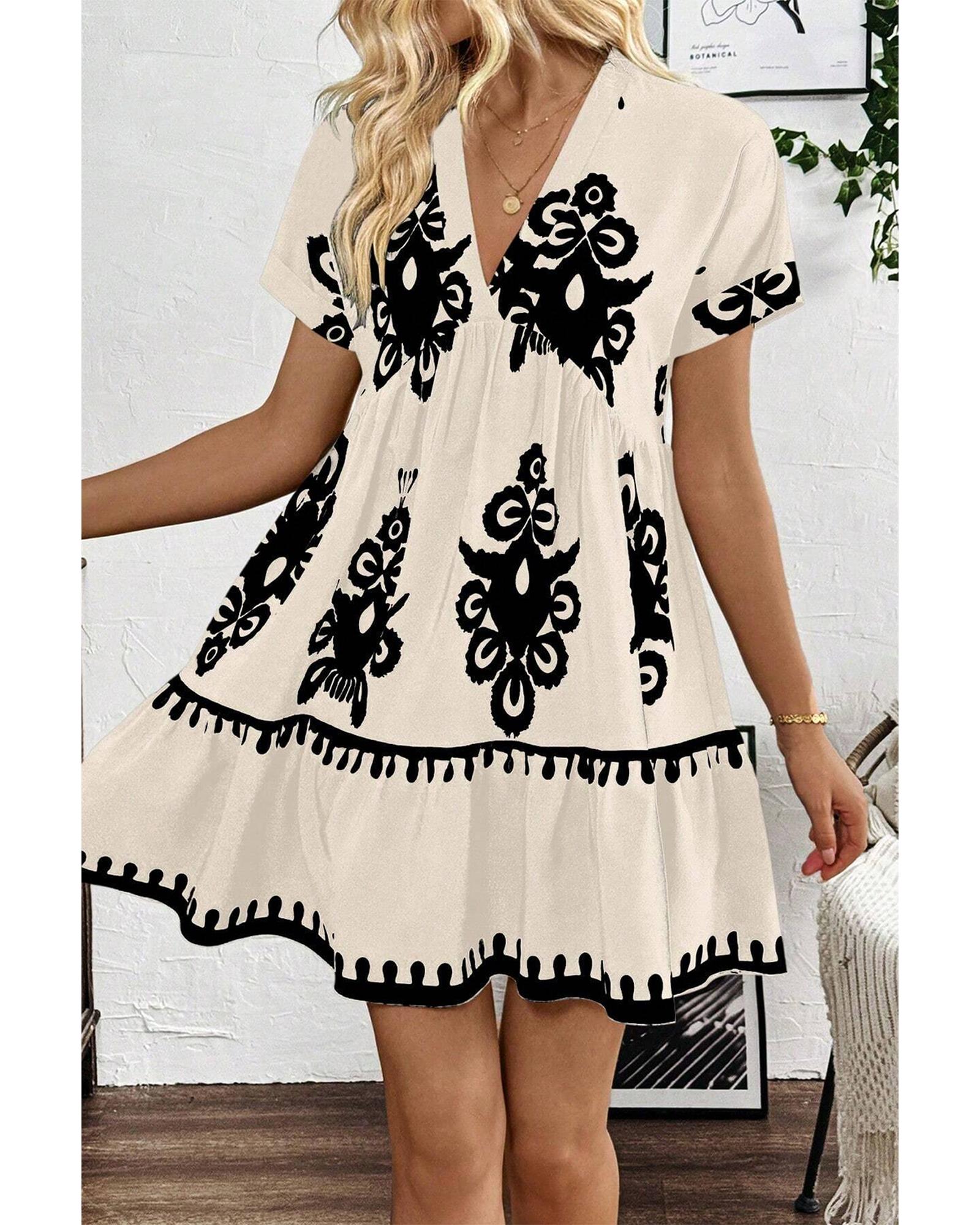 Black Vintage Print V Neck High Waist Short Sleeve Dress – L