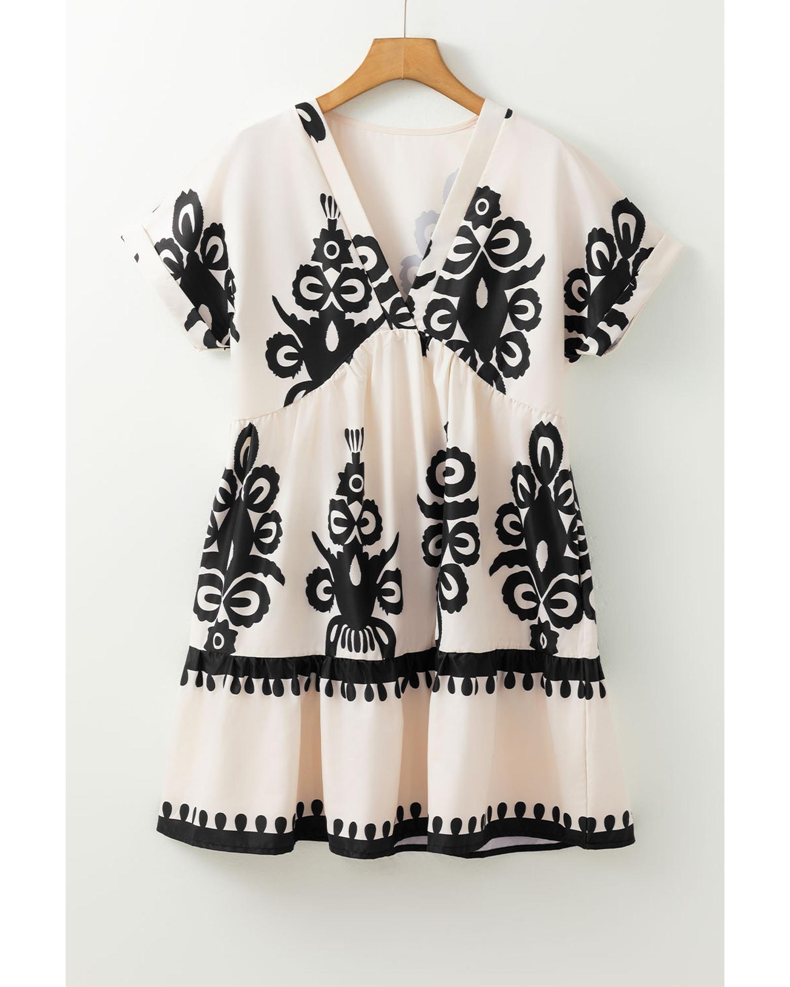 Black Vintage Print V Neck High Waist Short Sleeve Dress - L