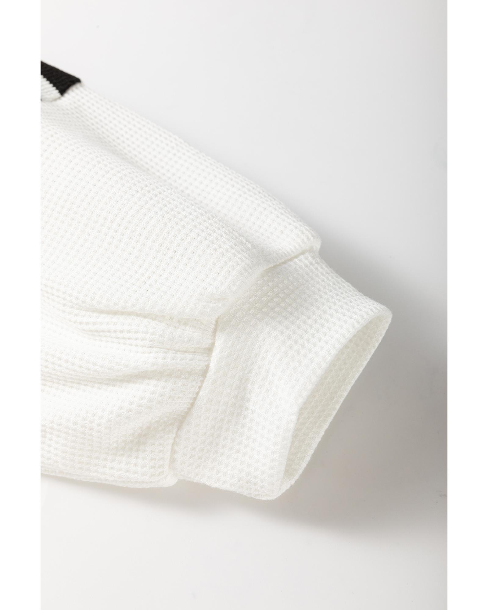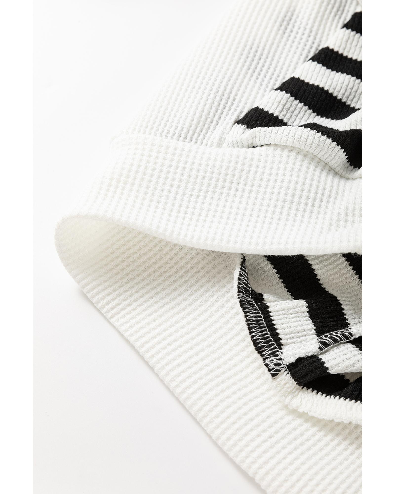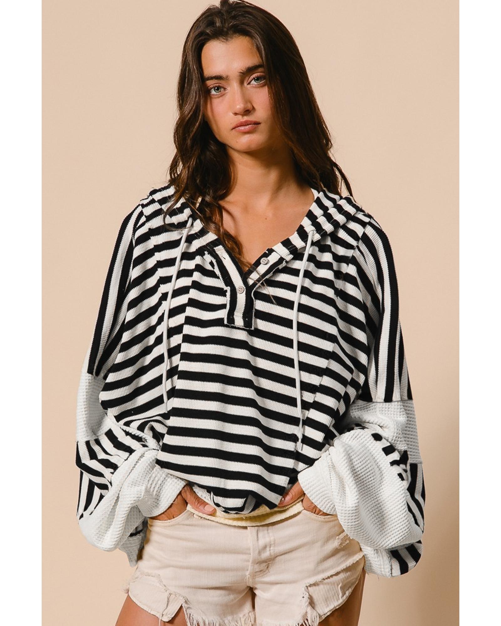 Black white Oversized Striped Henley Buttons Dolman Sleeve Hooded Top – L