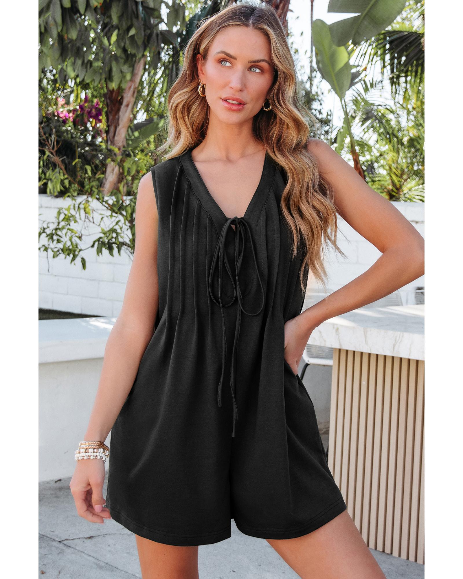 Black white Tie V Neck Pintuck Sleeveless Loose Romper – S