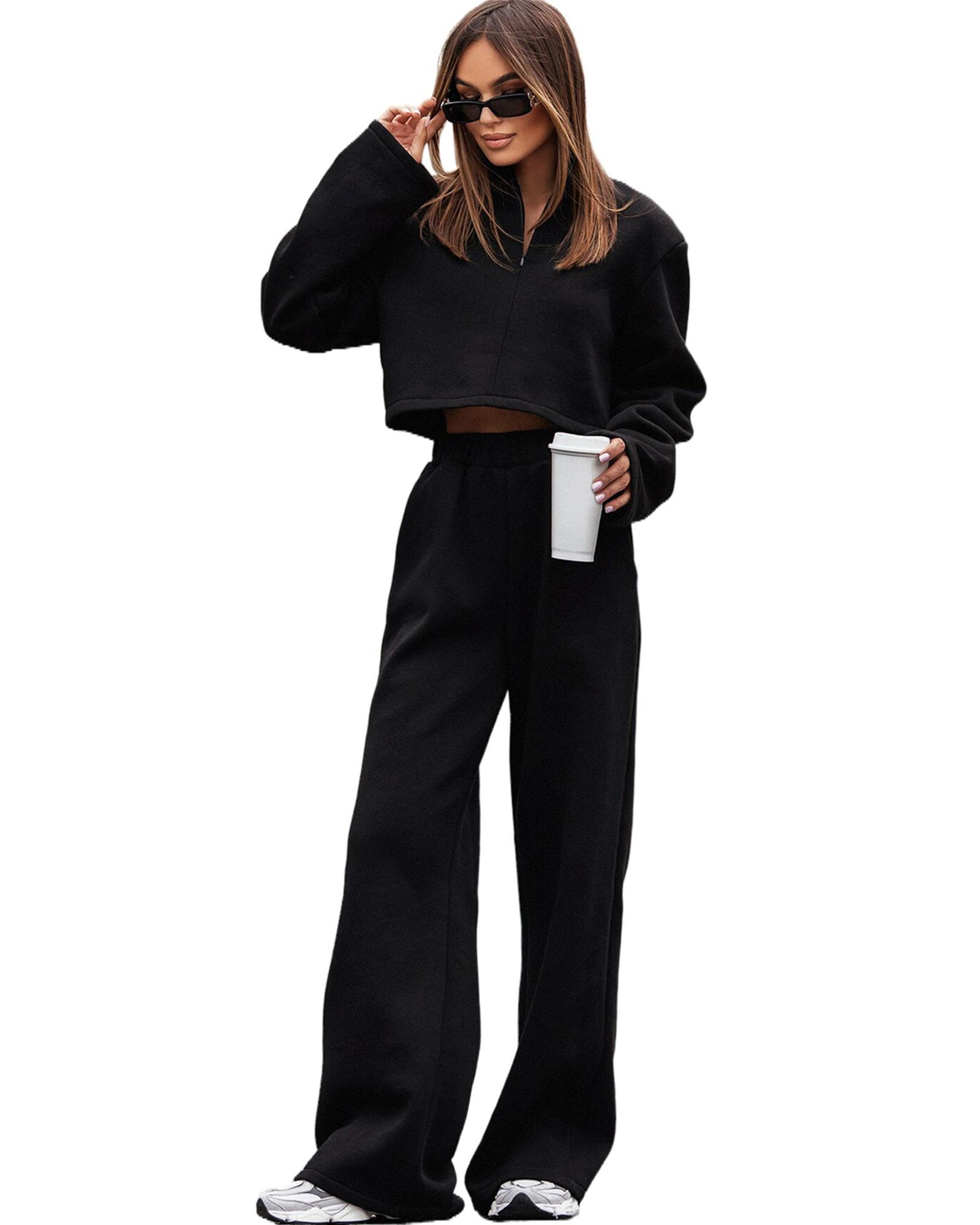 - Luxurious Black Zipped Collared Crop Top and Wide Leg Pants Set