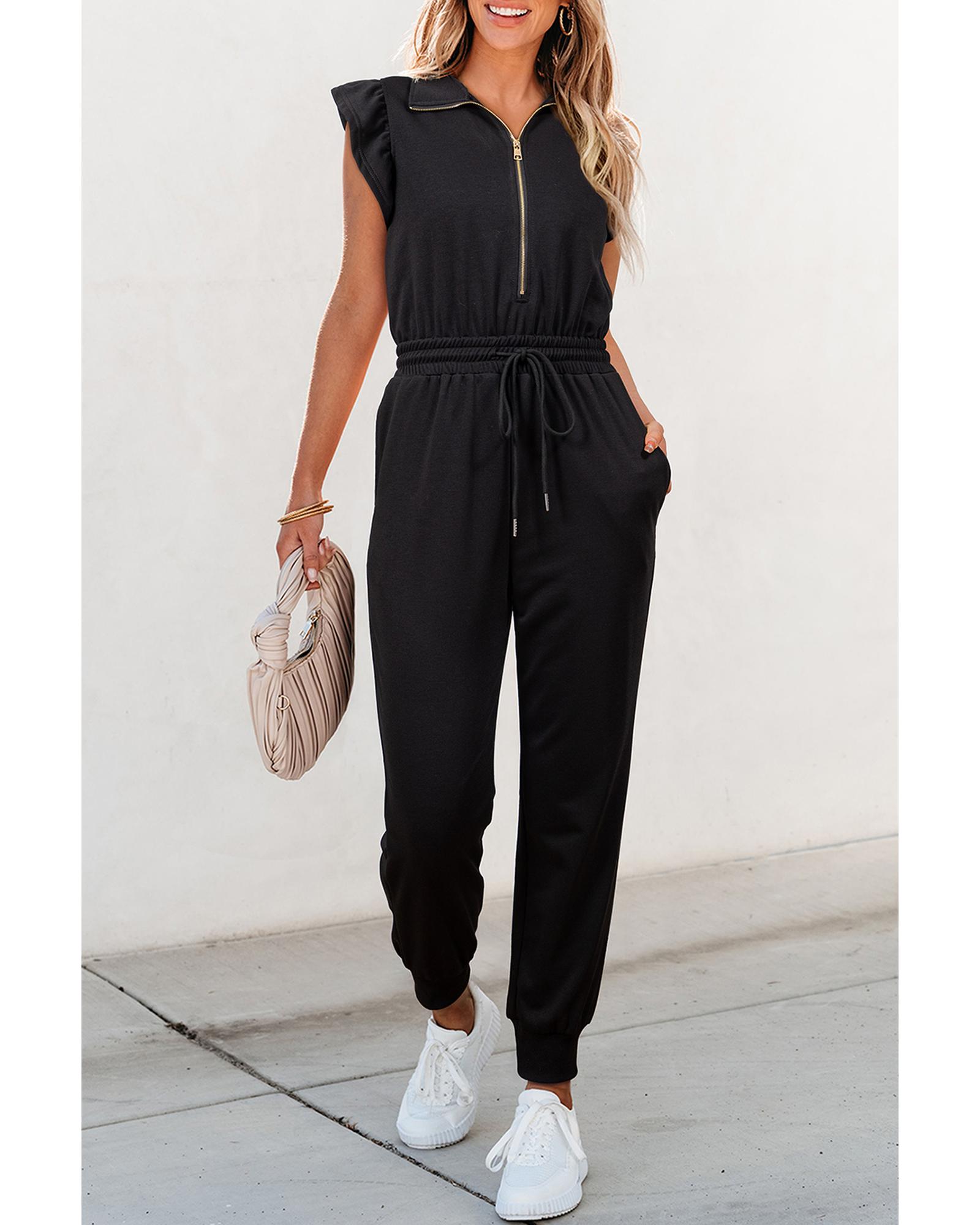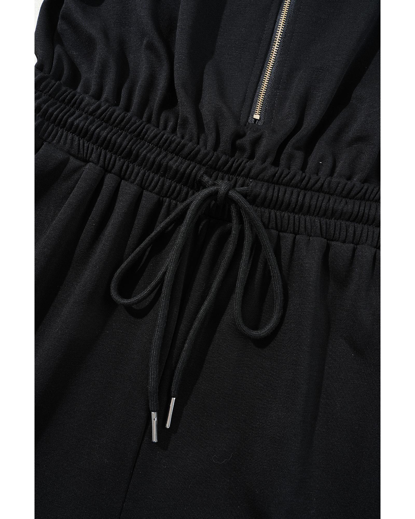 Black Zipper Flutter Sleeve Drawstring High Waist Jumpsuit – XL