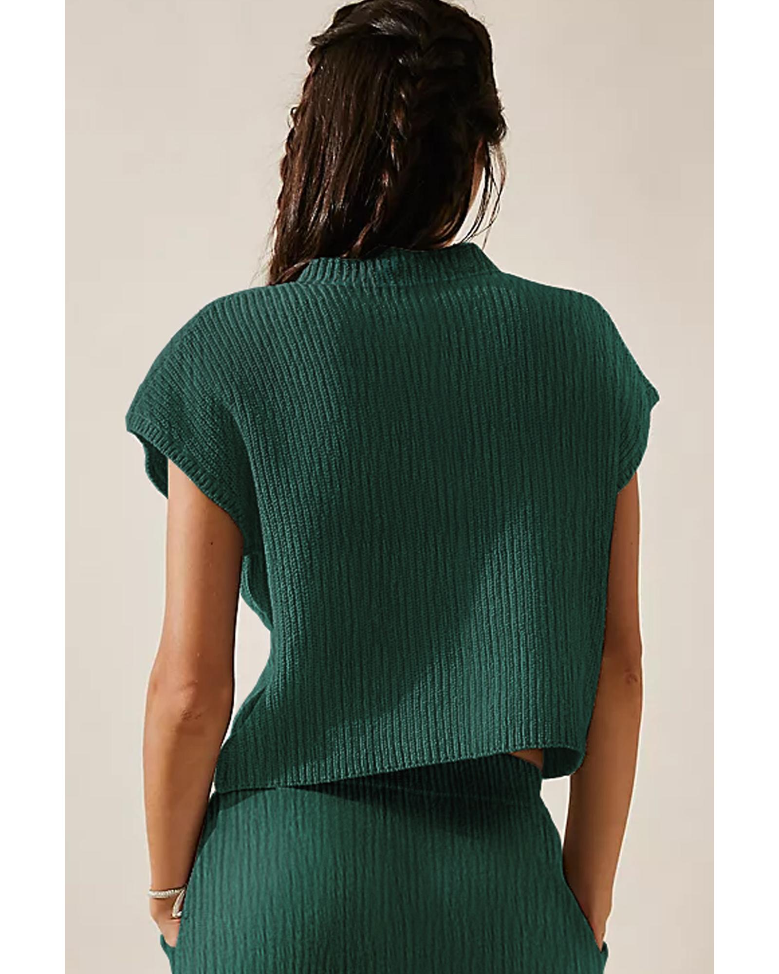 Blackish Green Chest Pocket V Neck Ribbed Cap Sleeve Sweater – L