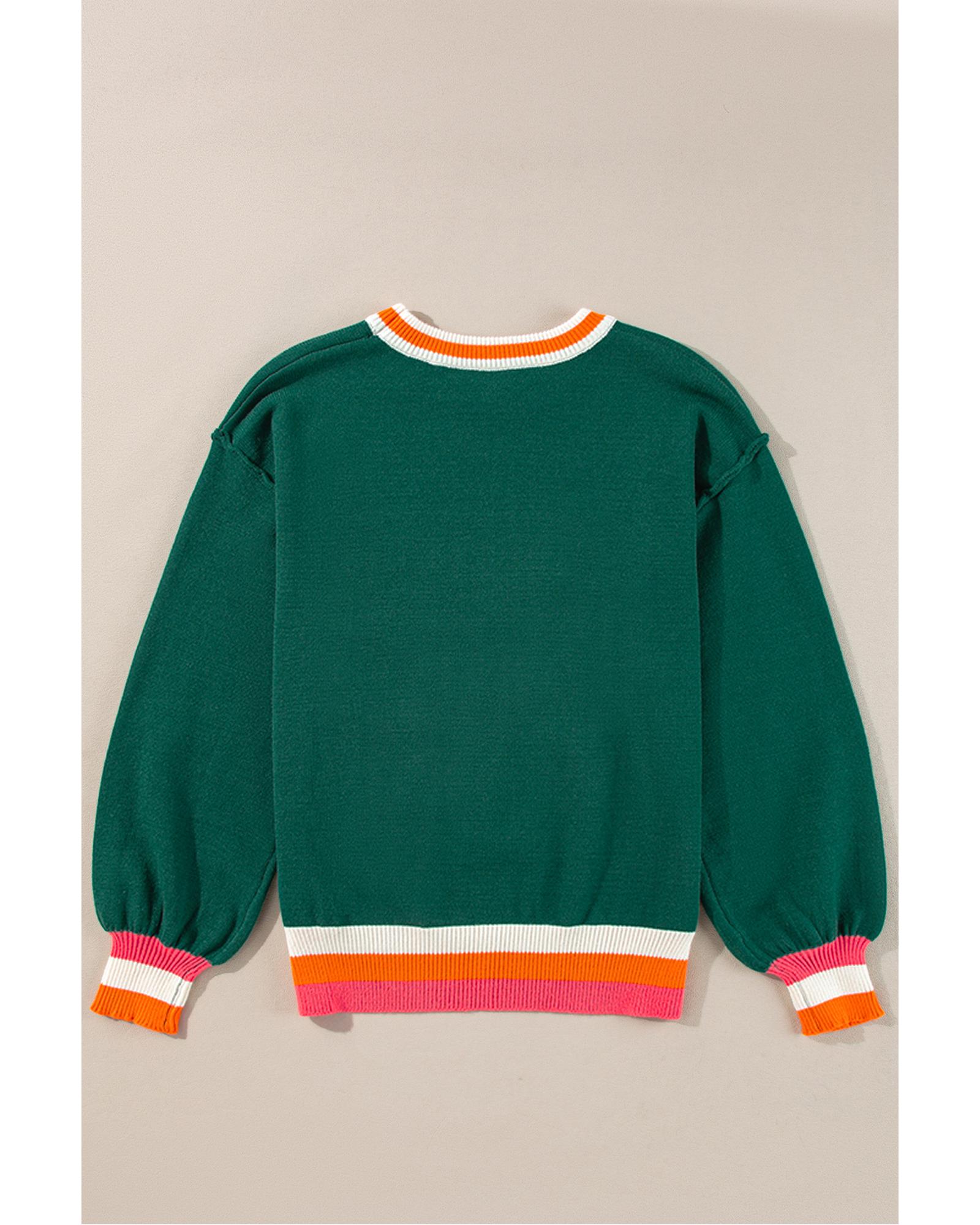 Blackish Green Colorblock Striped Trim Drop Shoulder Sweater – L