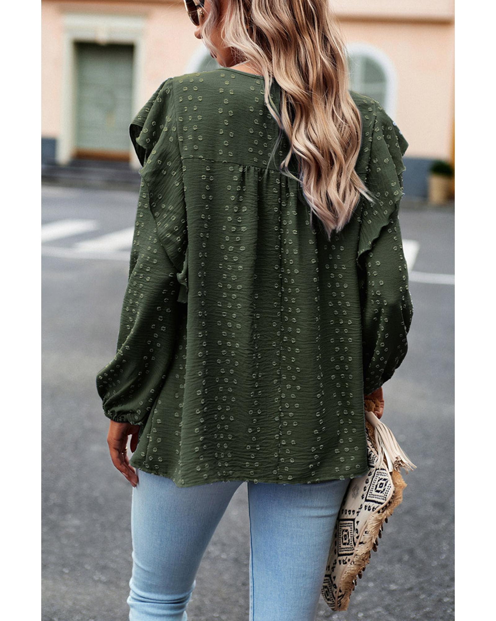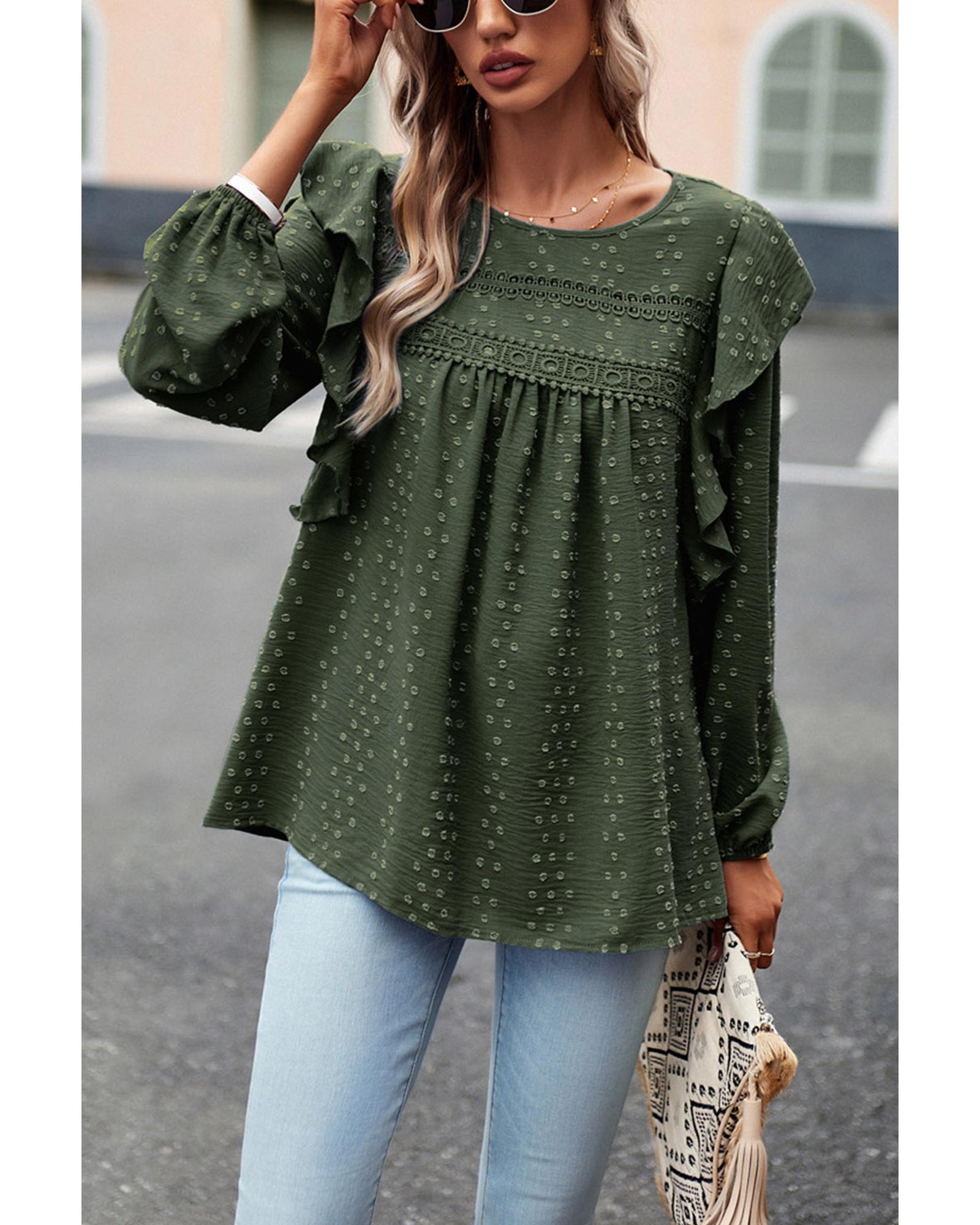 Blackish Green Lace Eyelet Ruffle Shoulder Long Sleeve Blouse – L