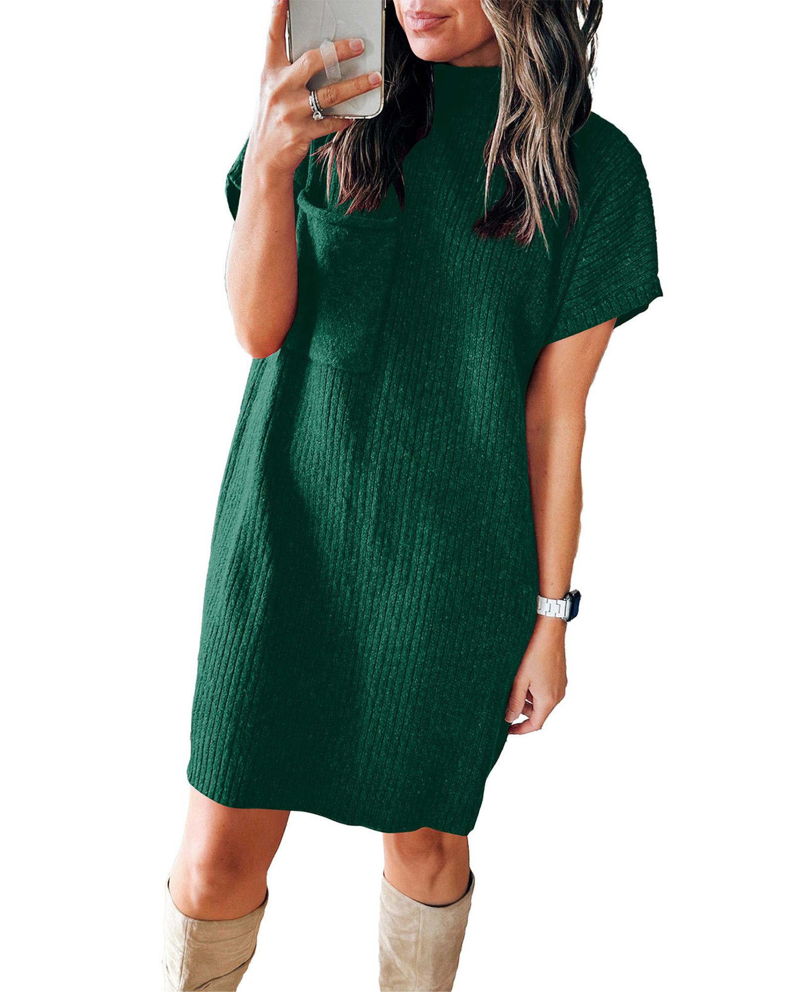 - Blackish green patch pocket ribbed knit short sleeve sweater dress