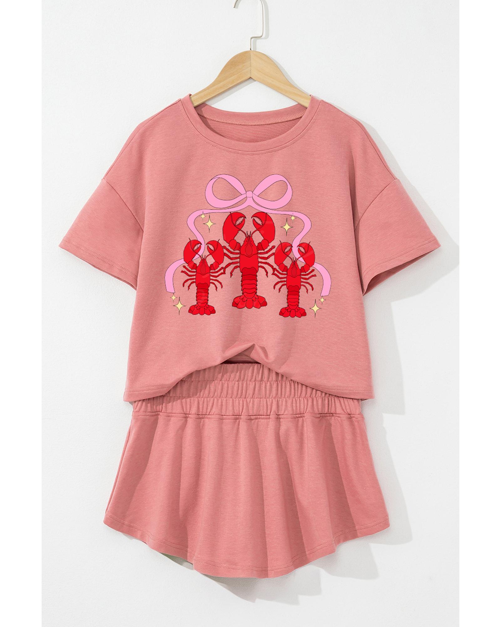 Blossom Bow Crawfish Print T Shirt and High Waist Ruffle Skorts Set – S