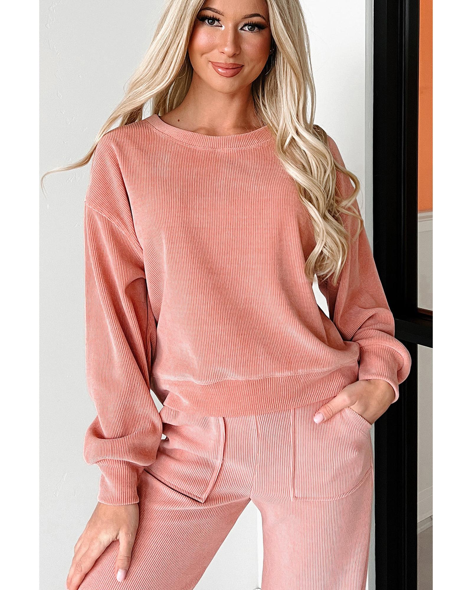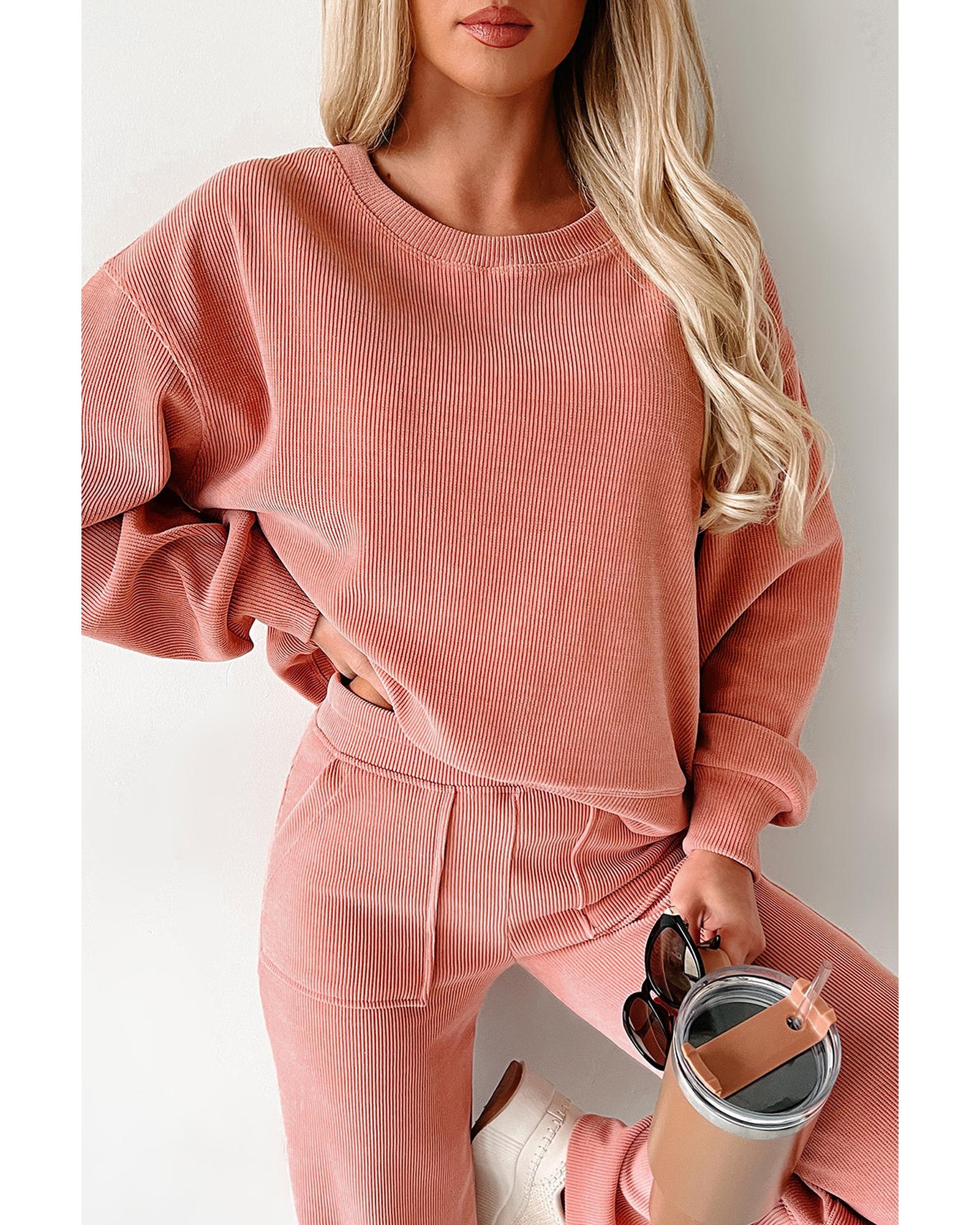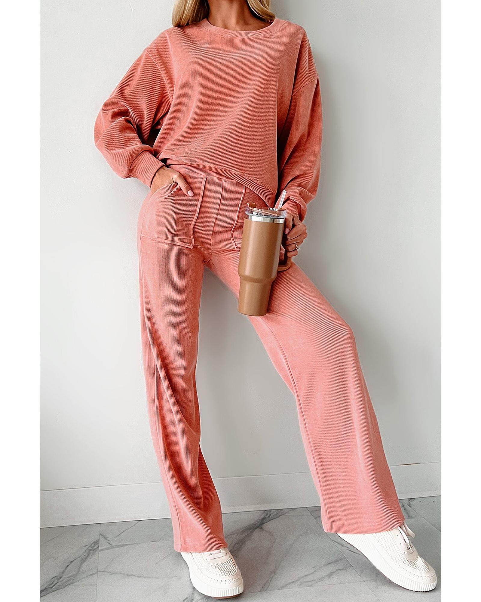 Blossom Ribbed Knit Drop Shoulder Pocketed Two Piece Lounge Set – M