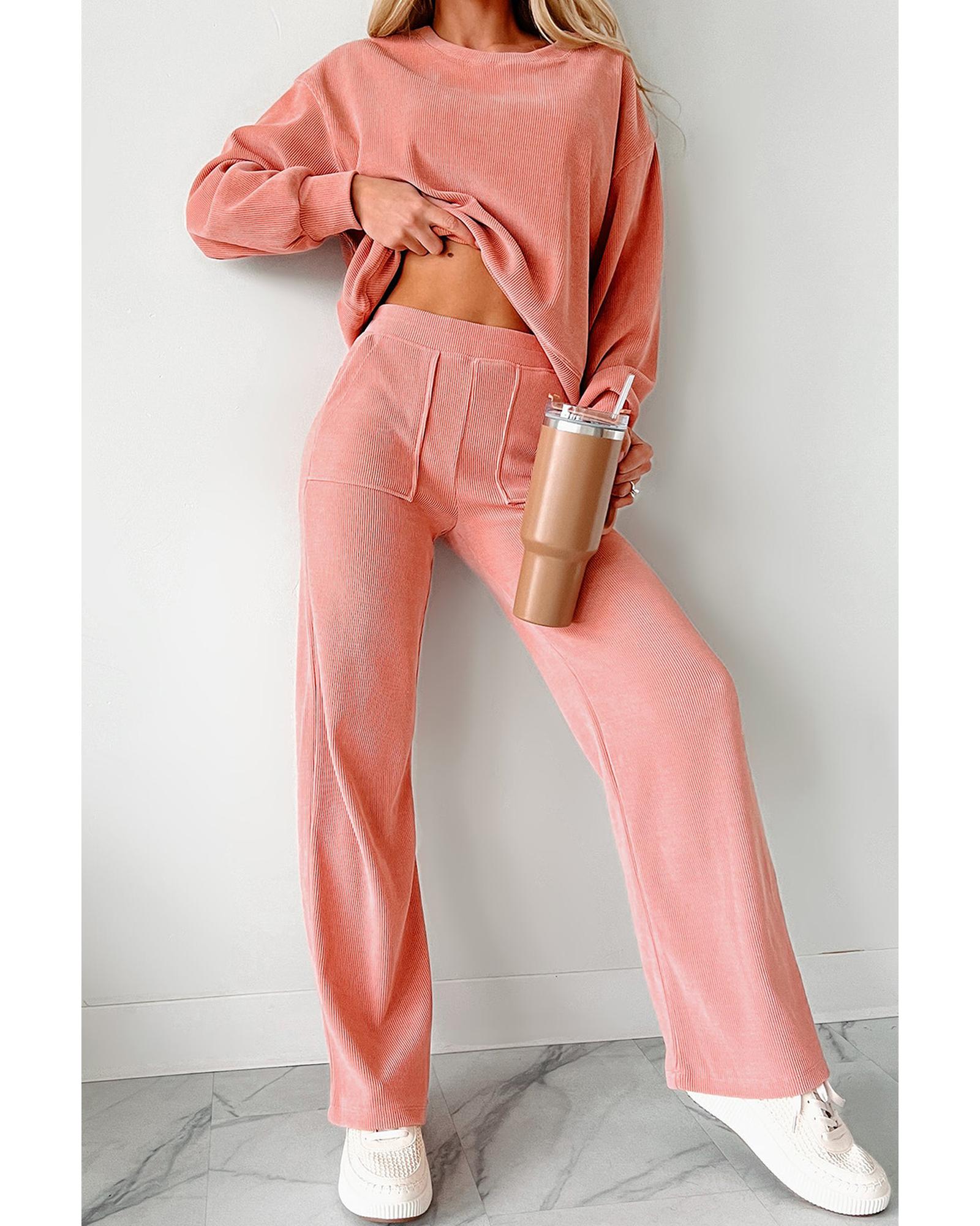 Blossom Ribbed Knit Drop Shoulder Pocketed Two Piece Lounge Set – XL
