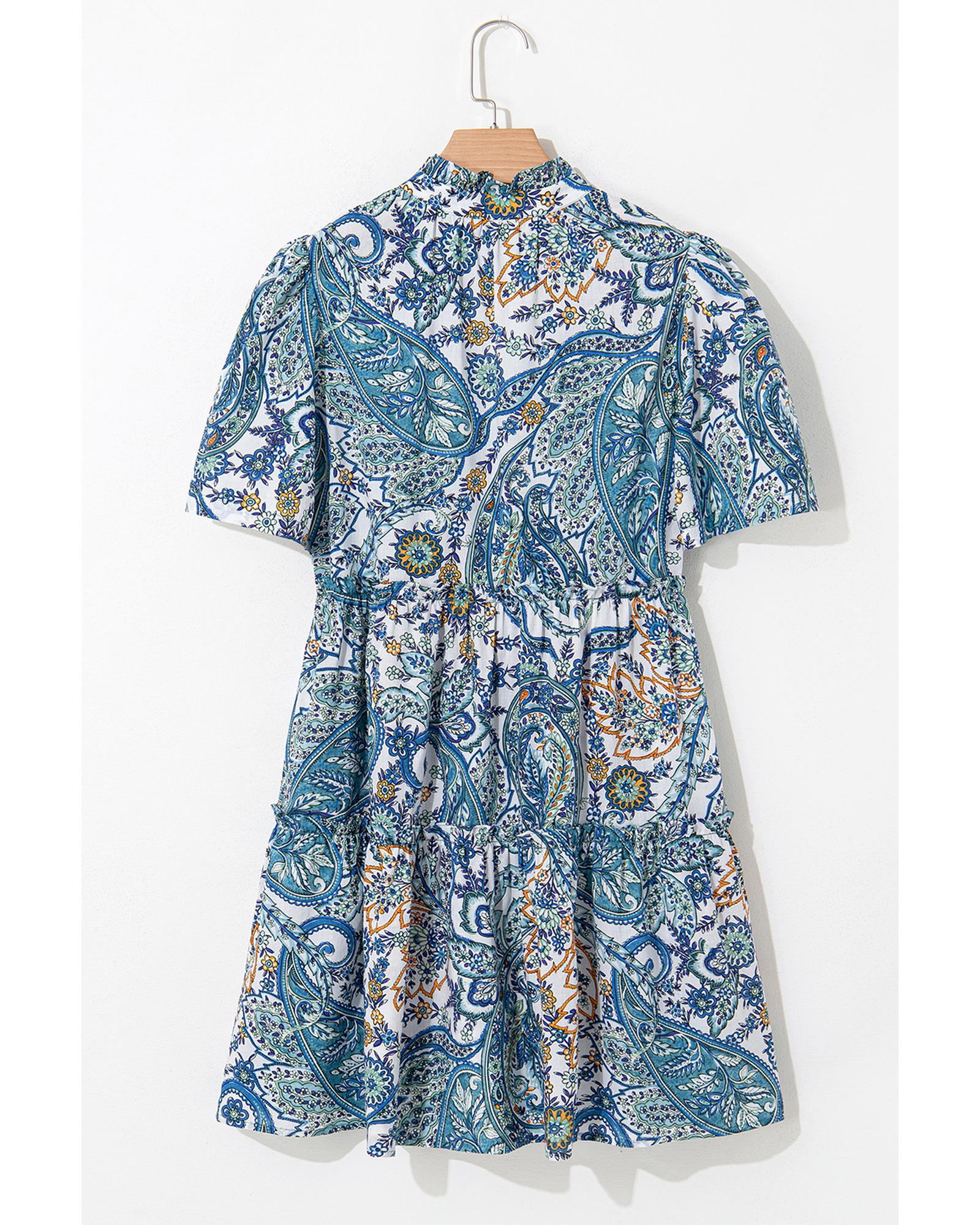 - Blue Bohemian Paisley Floral V Neck Short Sleeve Mini Dress