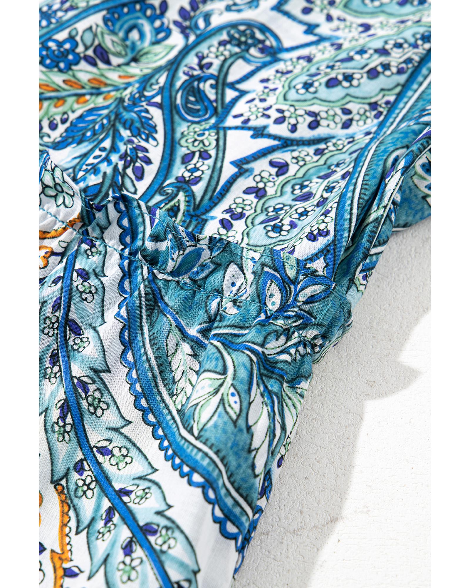 • Blue Bohemian Paisley Floral V Neck Short Sleeve Mini Dress