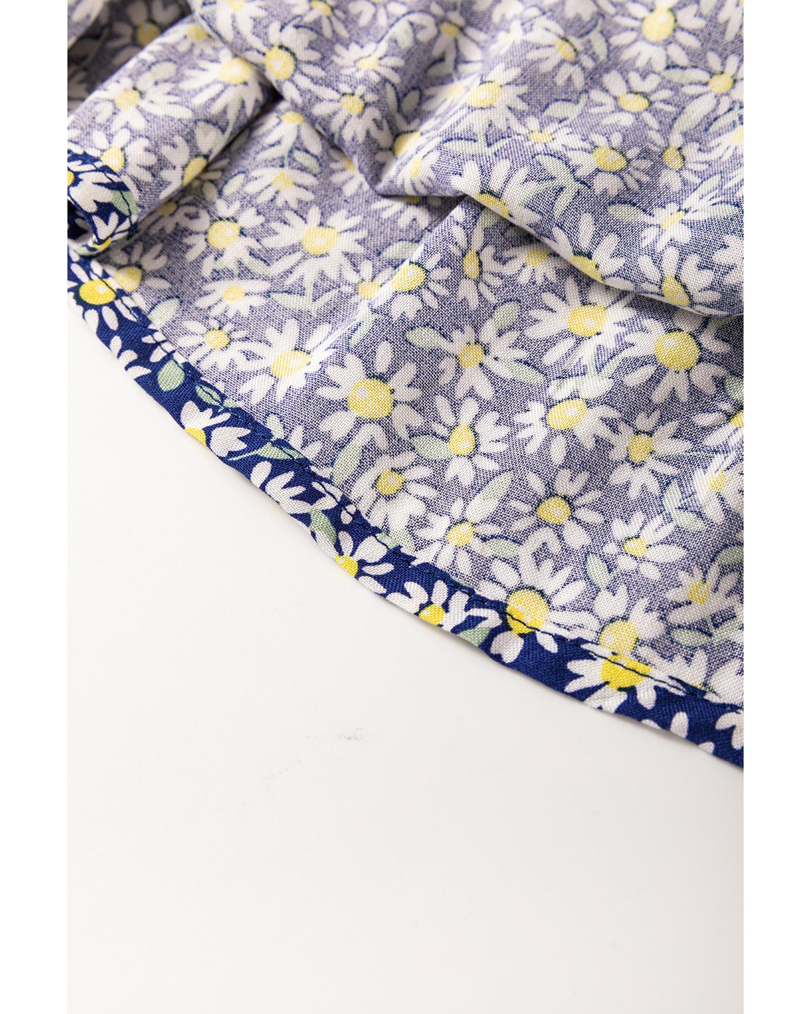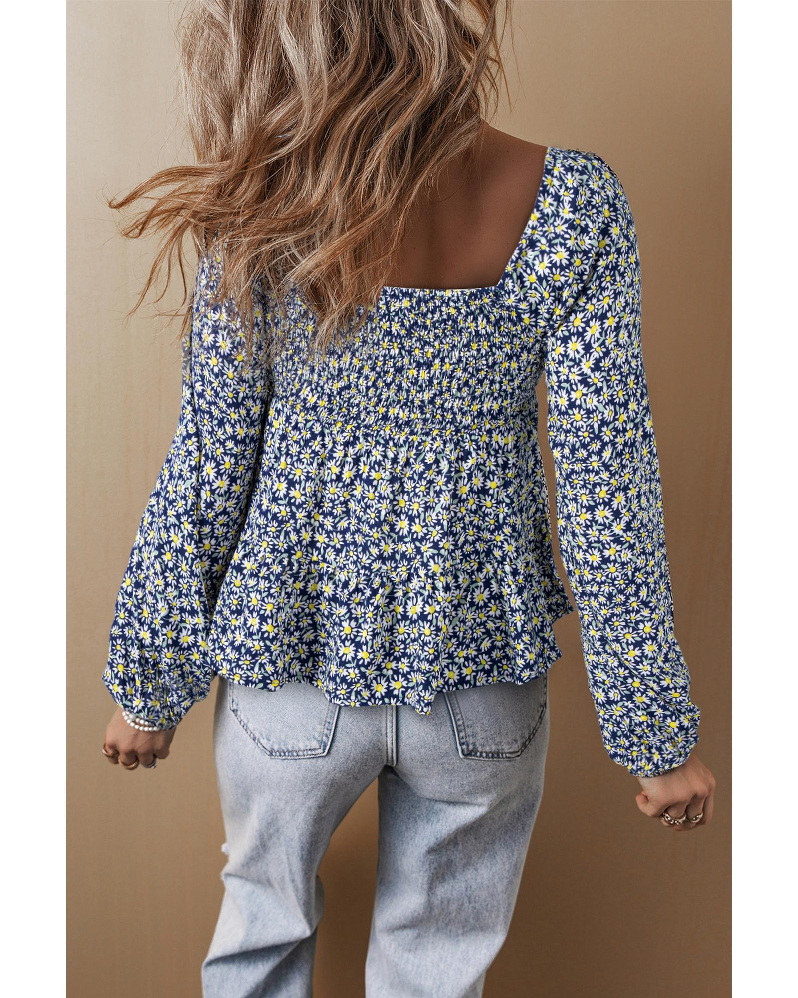 Blue Boho Floral Print Smocked Square Neck Loose Fit Blouse – L