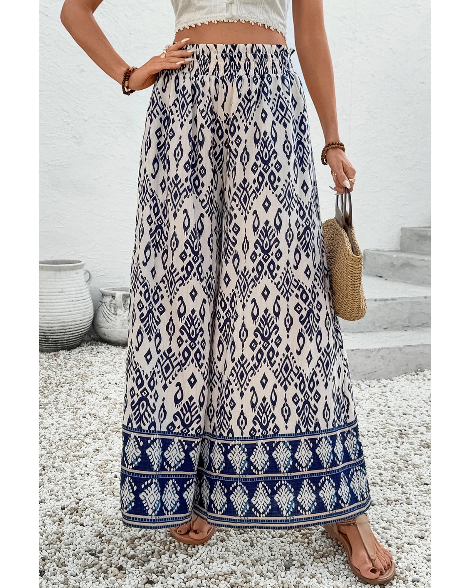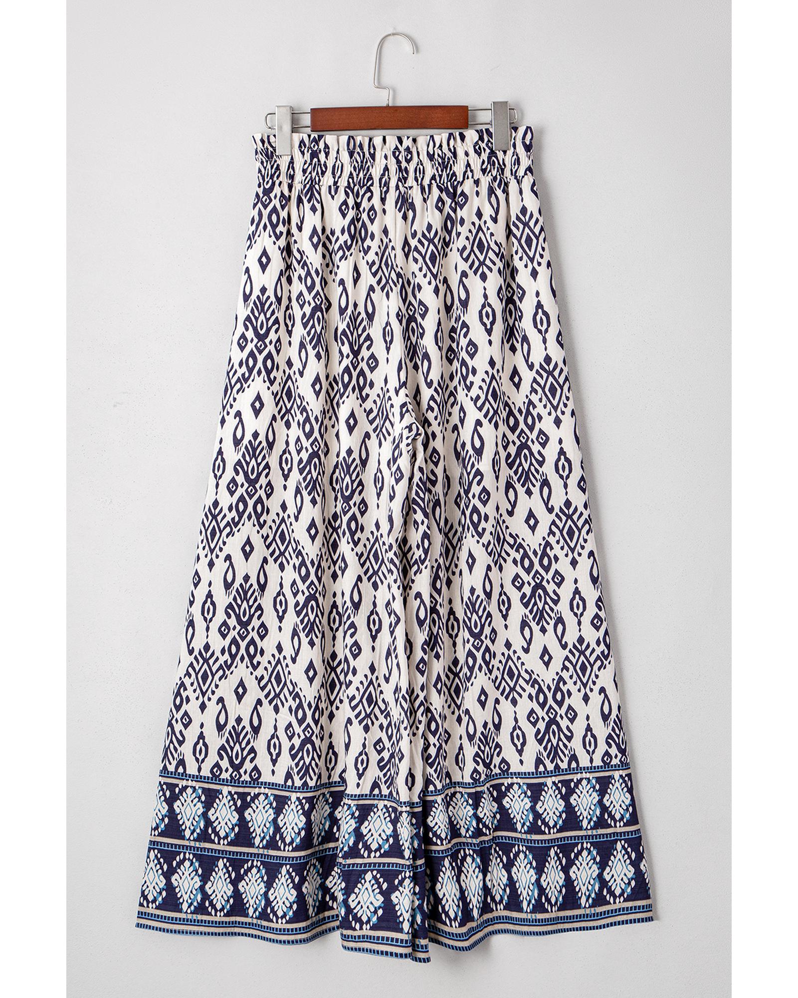 Blue Boho Pattern Print High Waist Wide Leg Loose Pants – S