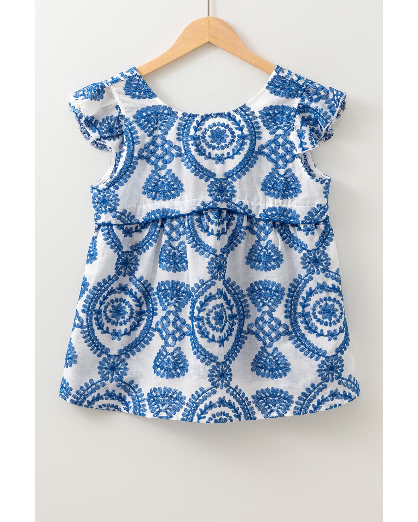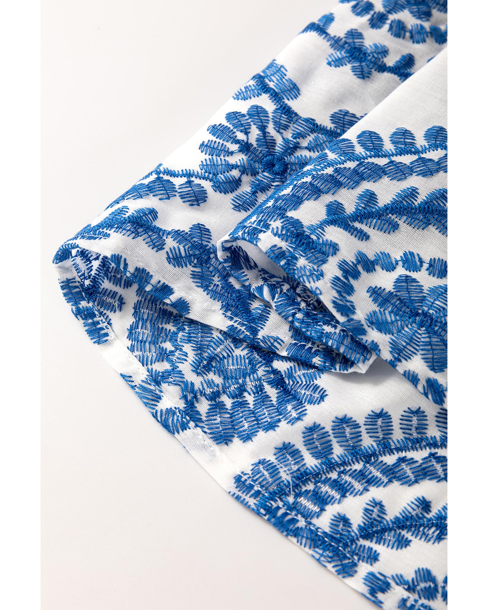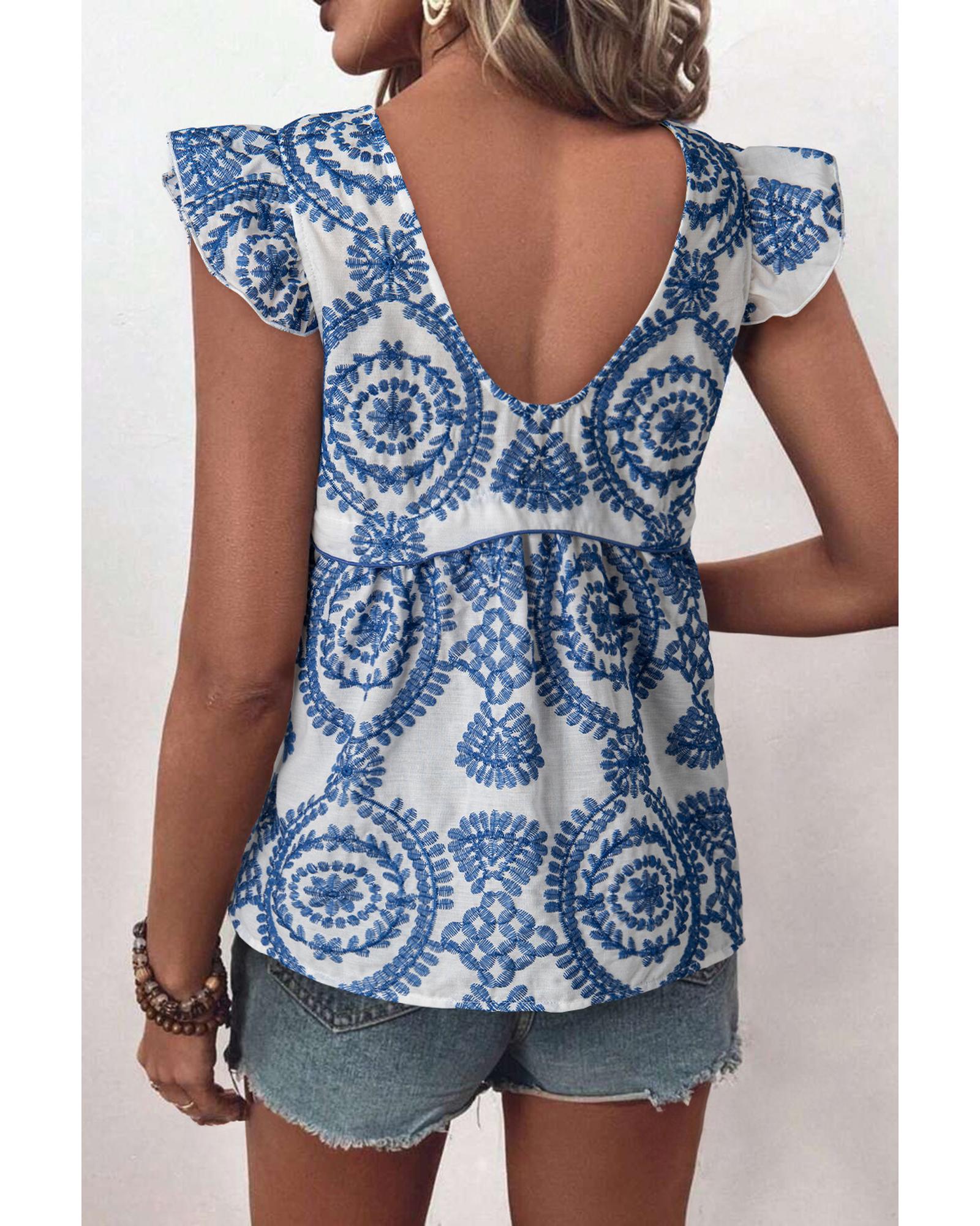 Blue Boho Print Flutter Sleeve Crew Neck Blouse – S