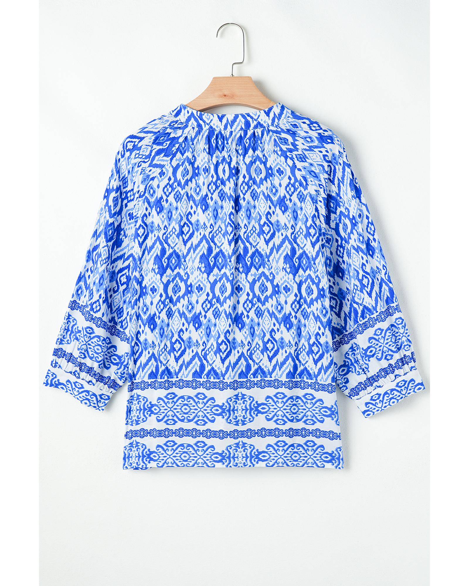 Blue Tribal Geometric Print 3/4 Sleeve Flowy Fit Blouse - S