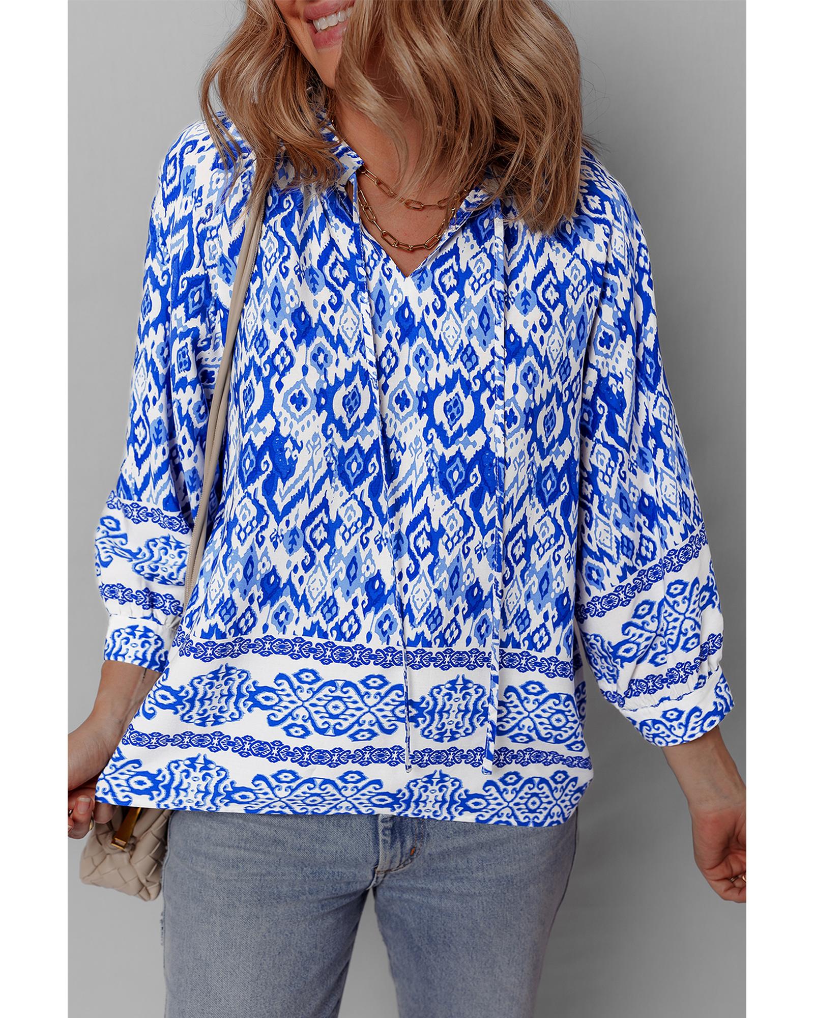 Blue Boho Printed 3/4 Sleeve Tied Neck Blouse – XL